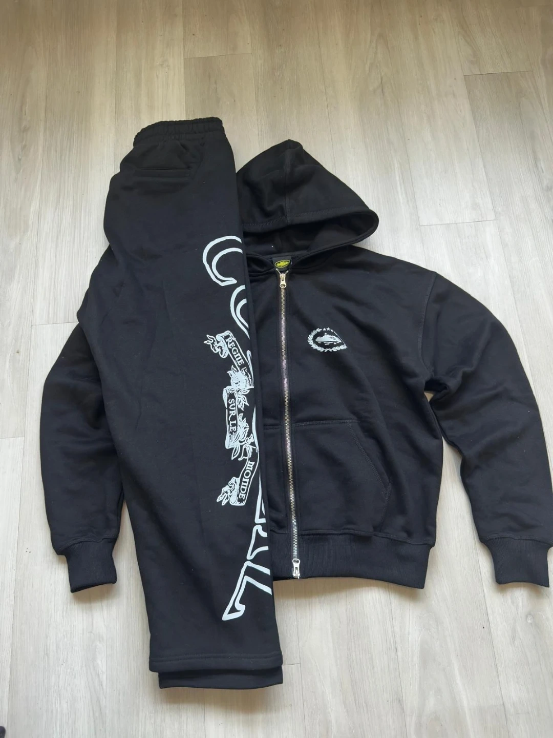 Selling a Corteiz matching set! It includes a black hoodie and sweatpants. The set features a unique design on both pieces. Great for a stylish and comfortable look!