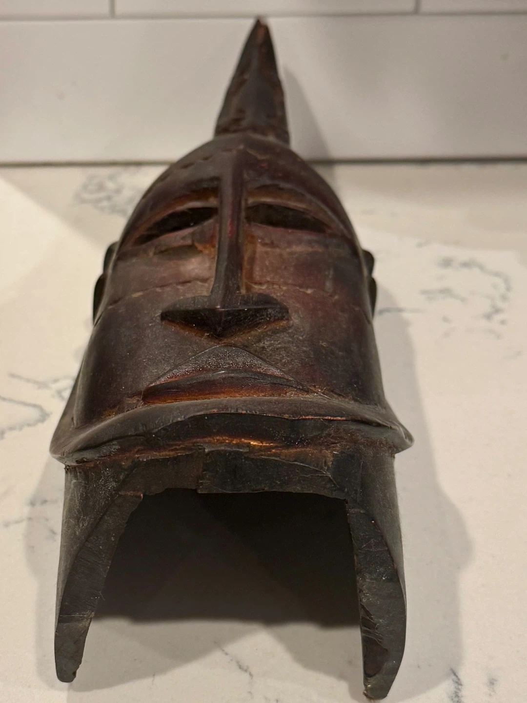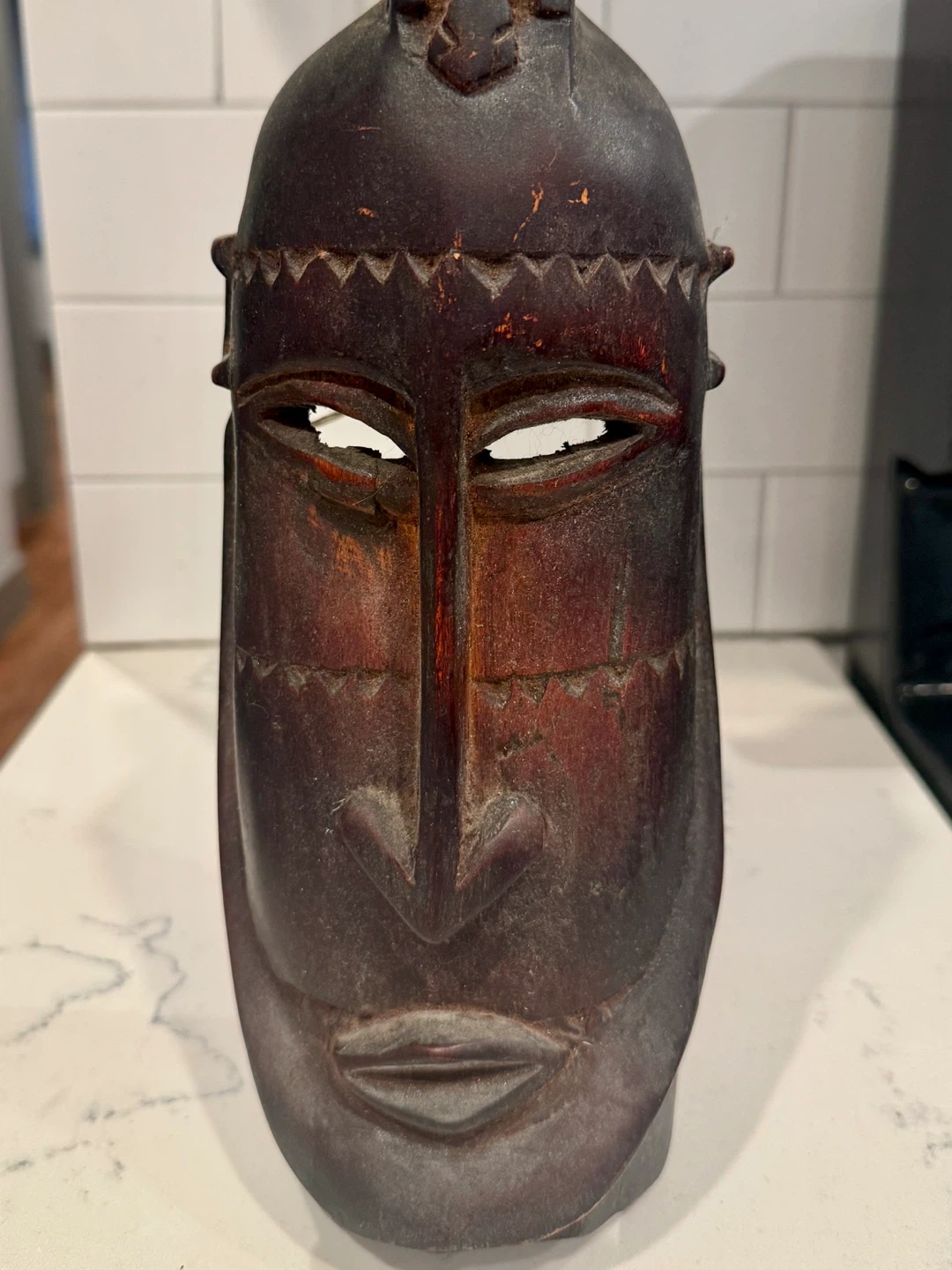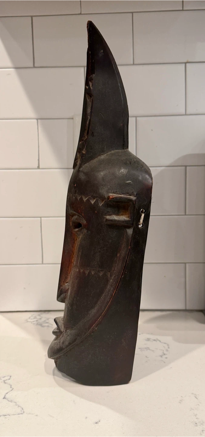 Hand-carved wooden West African mask purchased about 15 years ago at the Marché aux Puces de Saint-Ouen (Paris flea market). Beautiful aged patina and strong sculptural presence. Clearly hand-carved, not mass-produced.