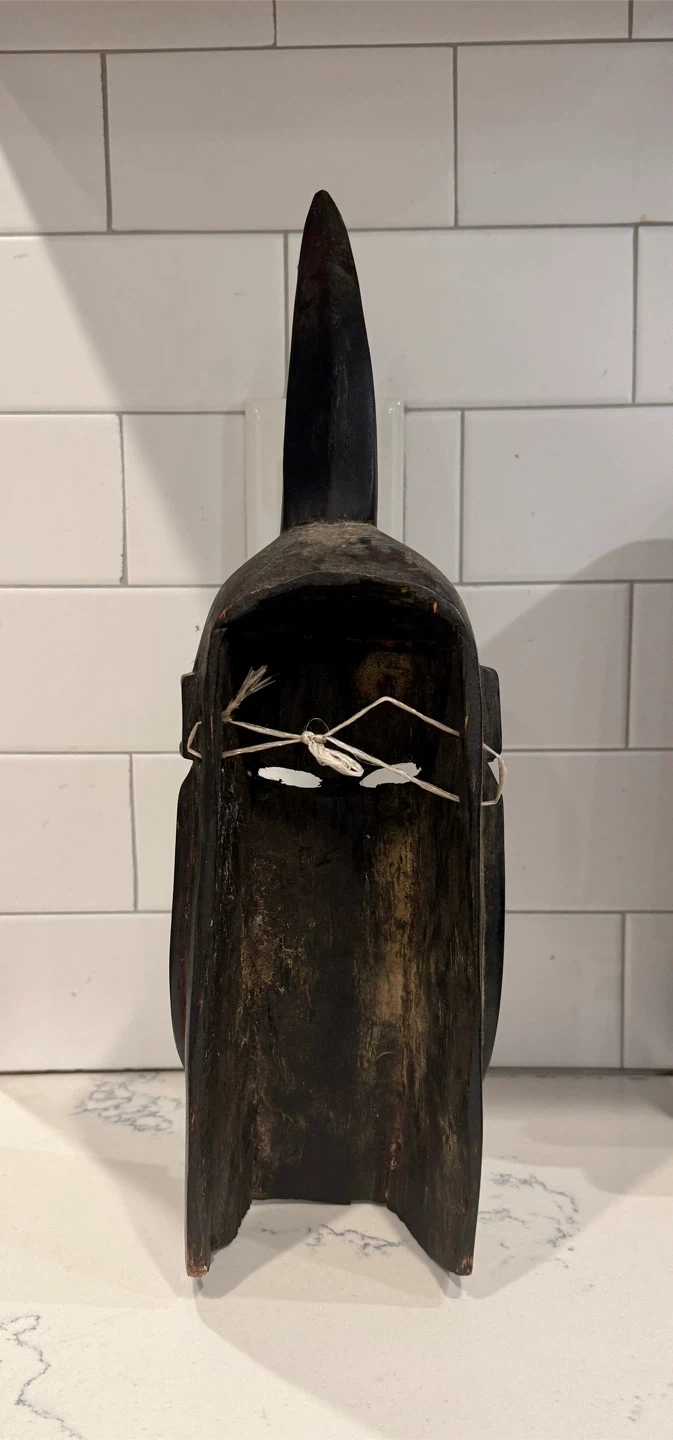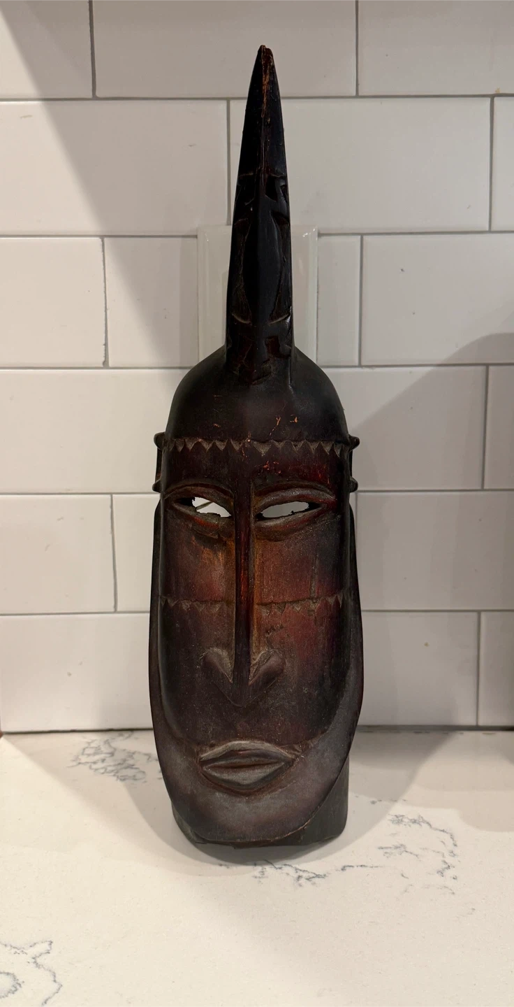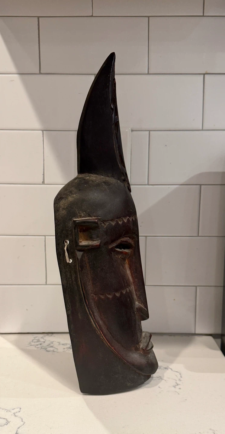 Hand-carved wooden West African mask purchased about 15 years ago at the Marché aux Puces de Saint-Ouen (Paris flea market). Beautiful aged patina and strong sculptural presence. Clearly hand-carved, not mass-produced.