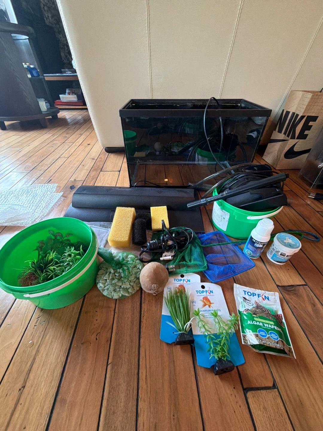 Selling an aquarium with various accessories! Includes the tank, a filter, plants, and other items for your fishy friends
