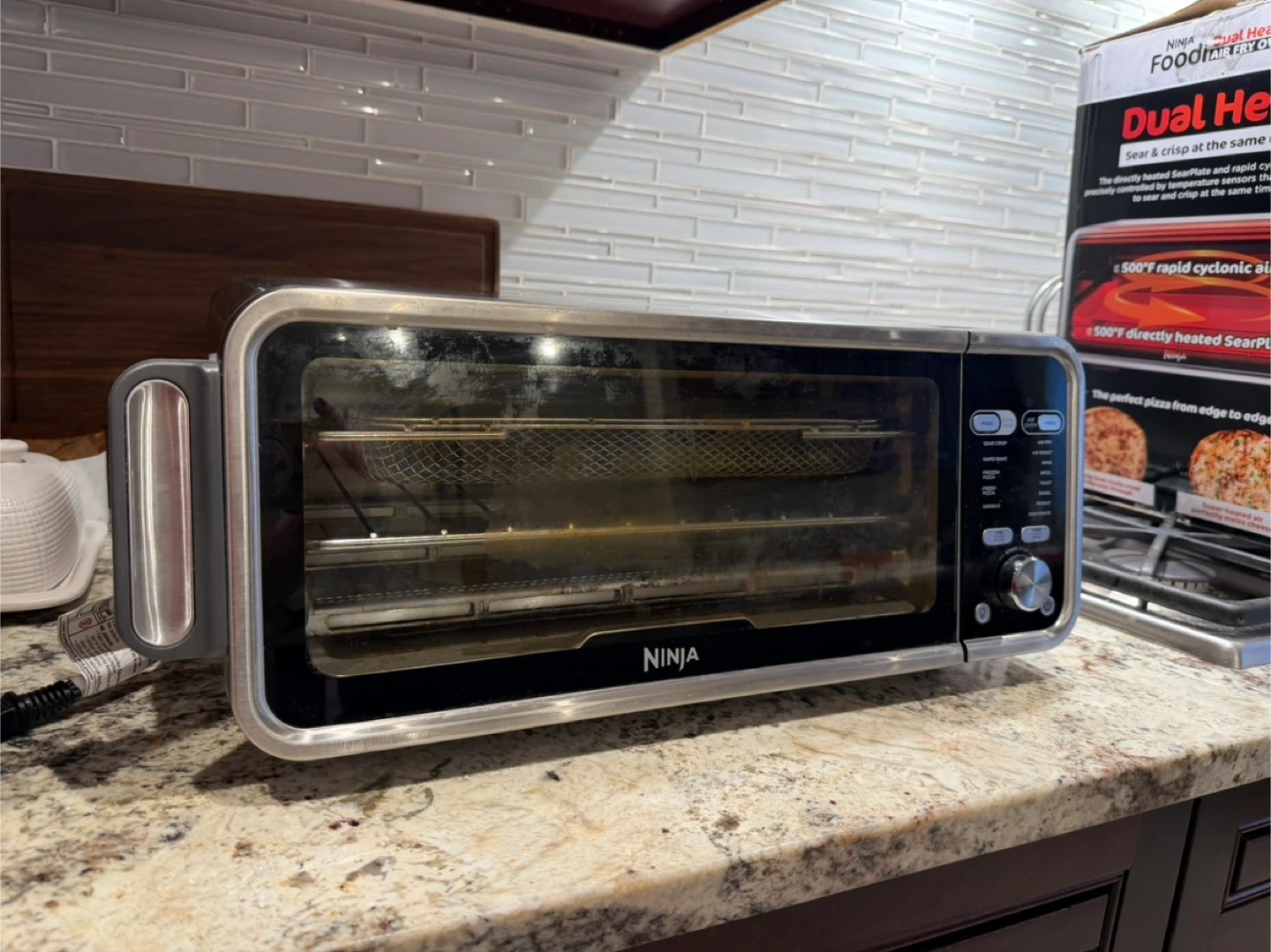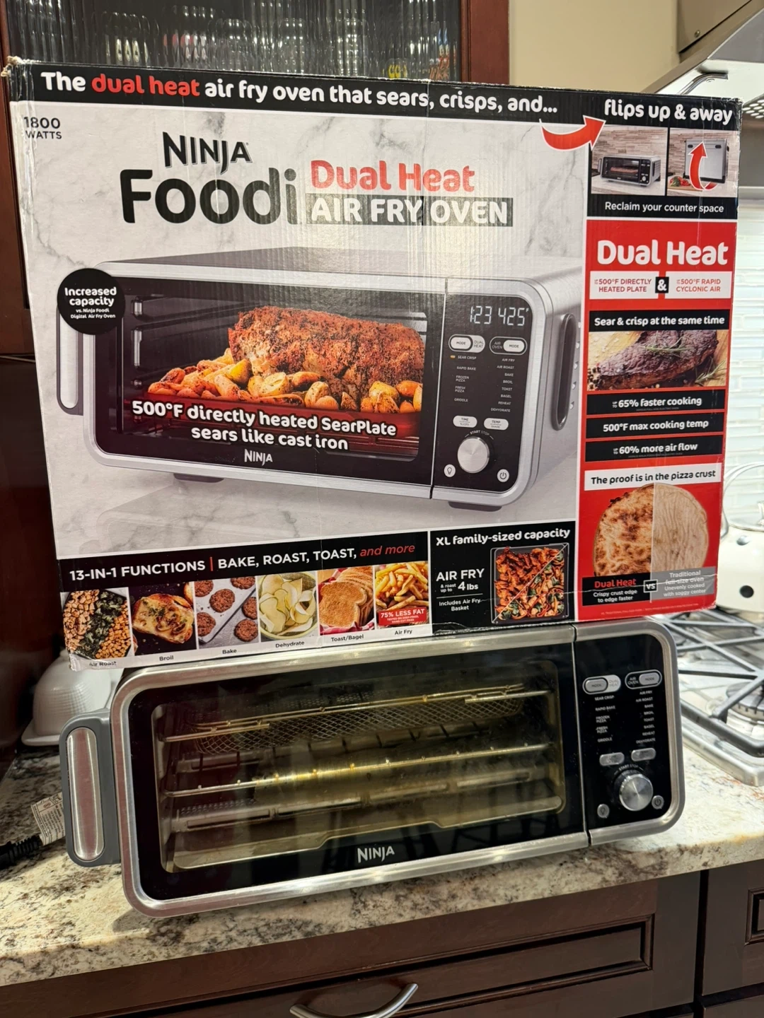 Selling a Ninja Foodi Dual Heat Air Fry Oven. This oven sears, crisps, and flips up and away for easy storage. It has a dual heat system and can reach 500°F directly heated SearPlate temperatures. It features 13-in-1 functions including bake, roast, toast, and more. It has an XL family-sized capacity perfect for cooking for a group