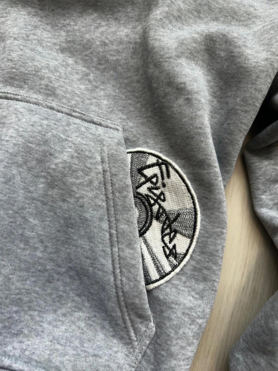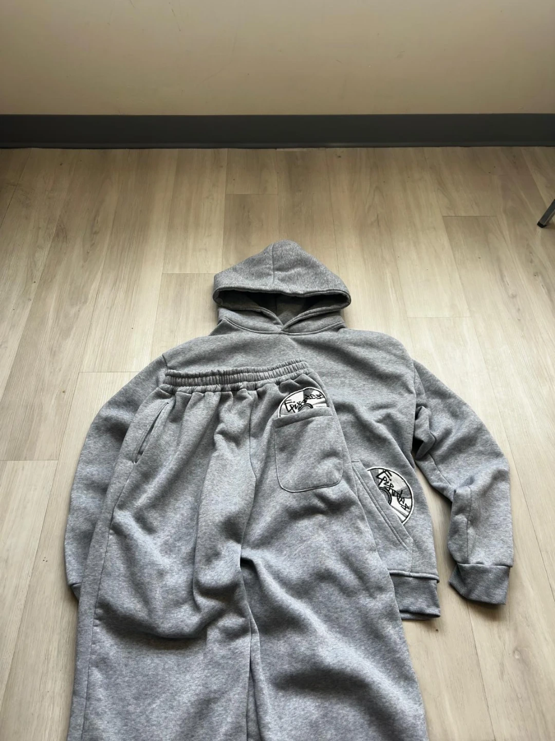 Selling a comfy grey fleece tracksuit set. It includes a hoodie and matching sweatpants. Perfect for lounging or casual wear!