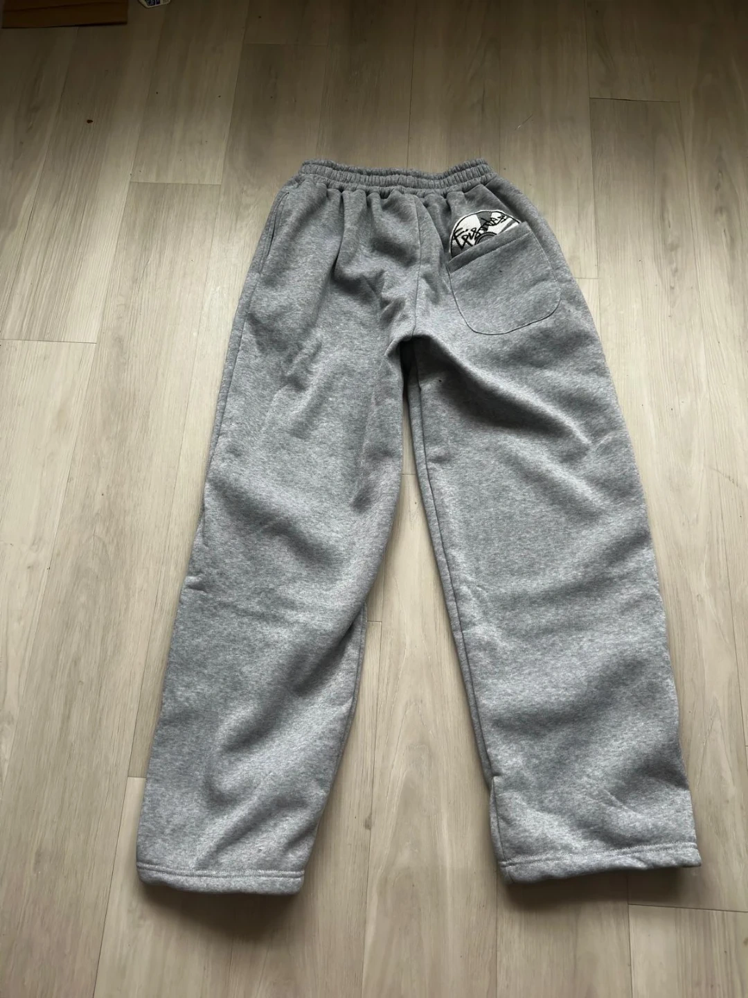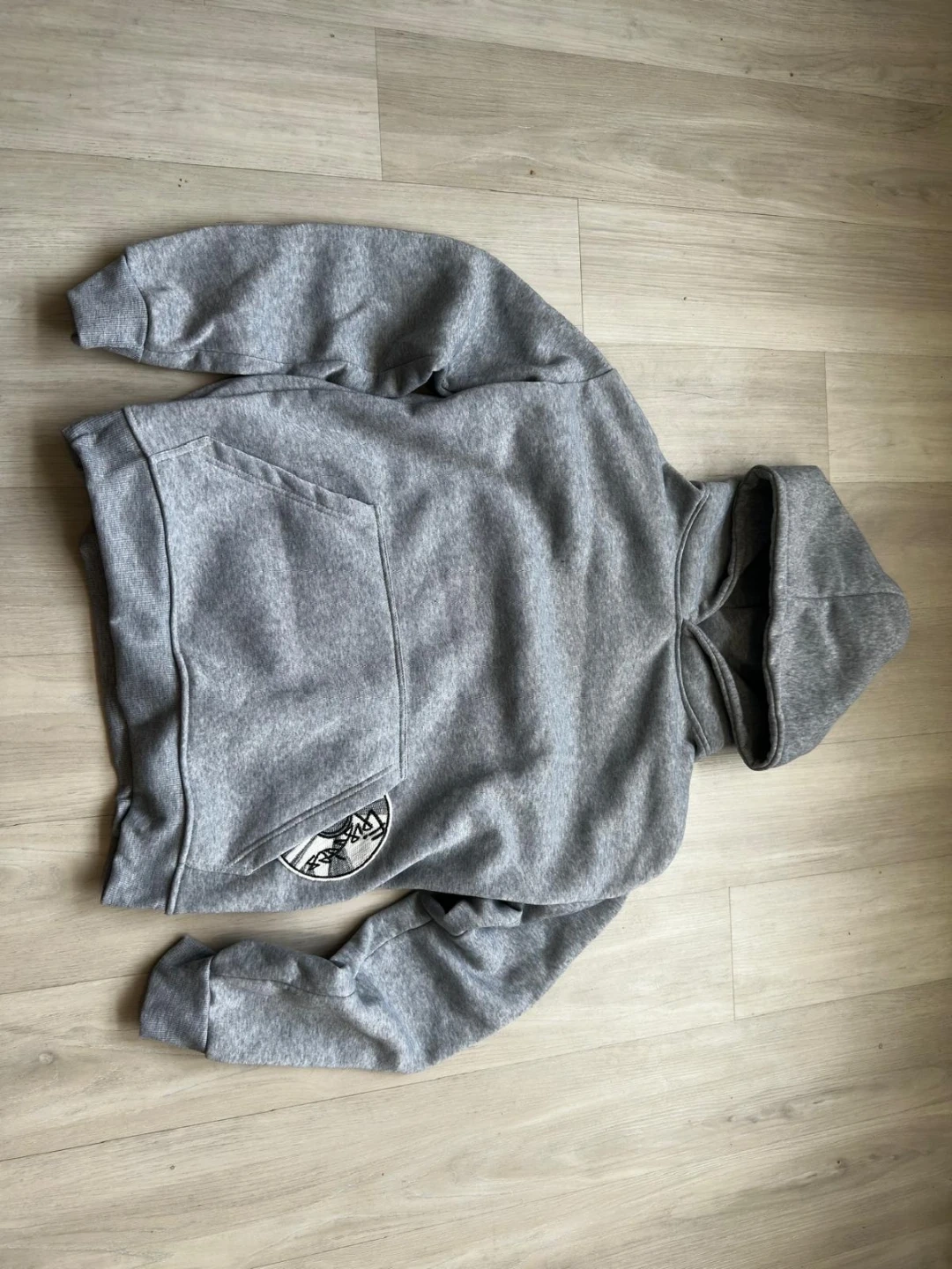 Selling a comfy grey fleece tracksuit set. It includes a hoodie and matching sweatpants. Perfect for lounging or casual wear!