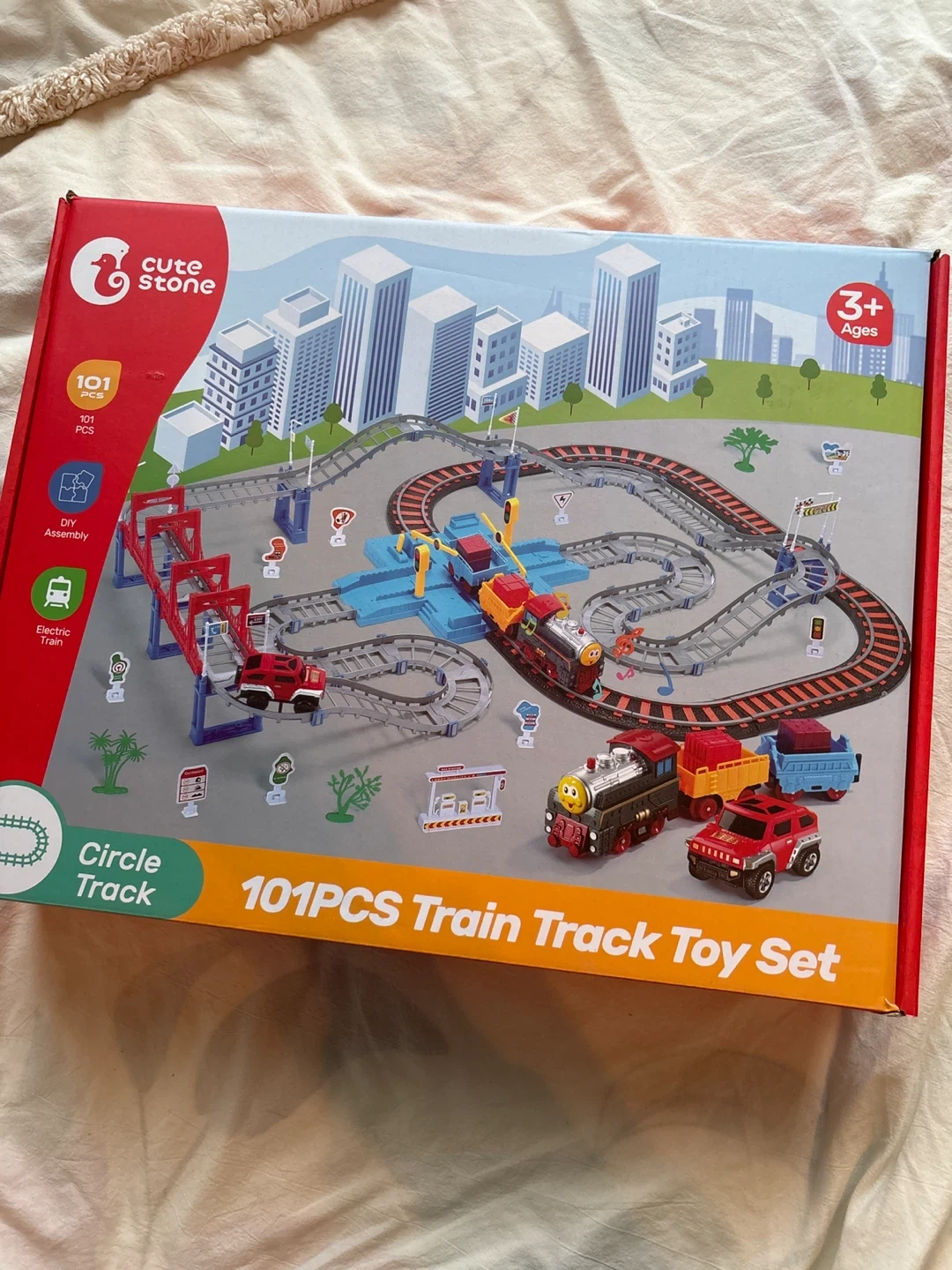 This is a Cute Stone 101PCS Train Track Toy Set for toddlers aged 3+. It features an electric train and car, easy to assemble DIY creative track, light effects, and various road signs to simulate real urban traffic scenes. The box is included