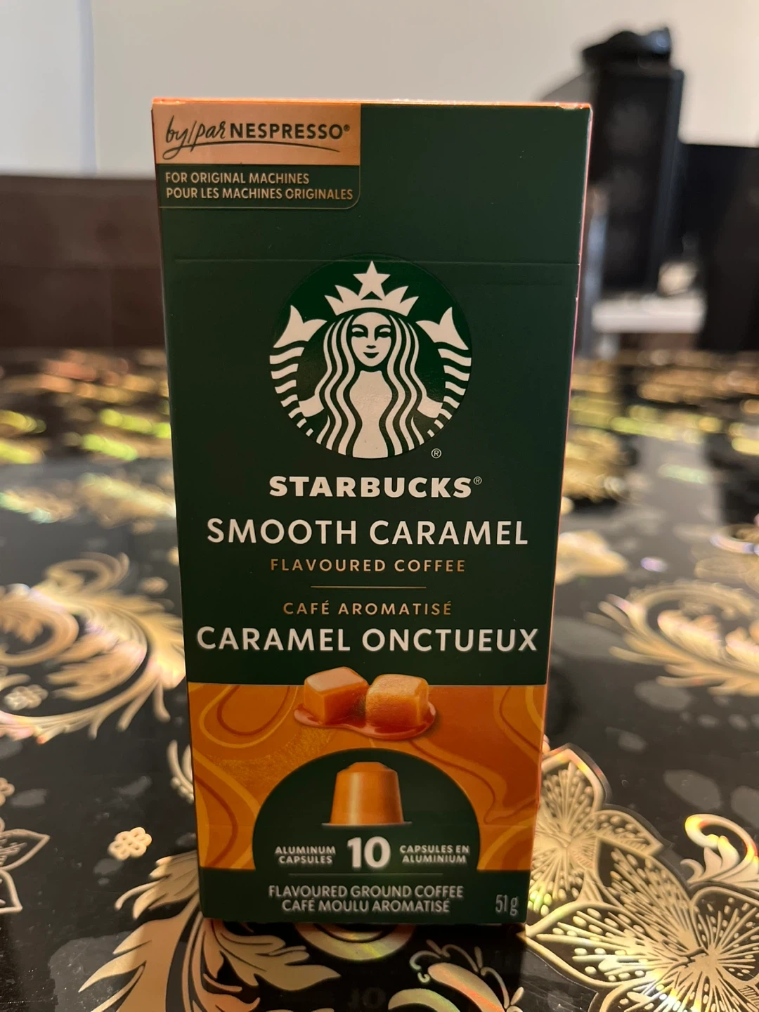Selling per box of Starbucks Smooth Caramel flavoured coffee Nespresso pods! This box contains 10 capsules, perfect for original Nespresso machines. Enjoy the notes of buttery caramel and vanilla in every cup. Production date is 2025 October 25