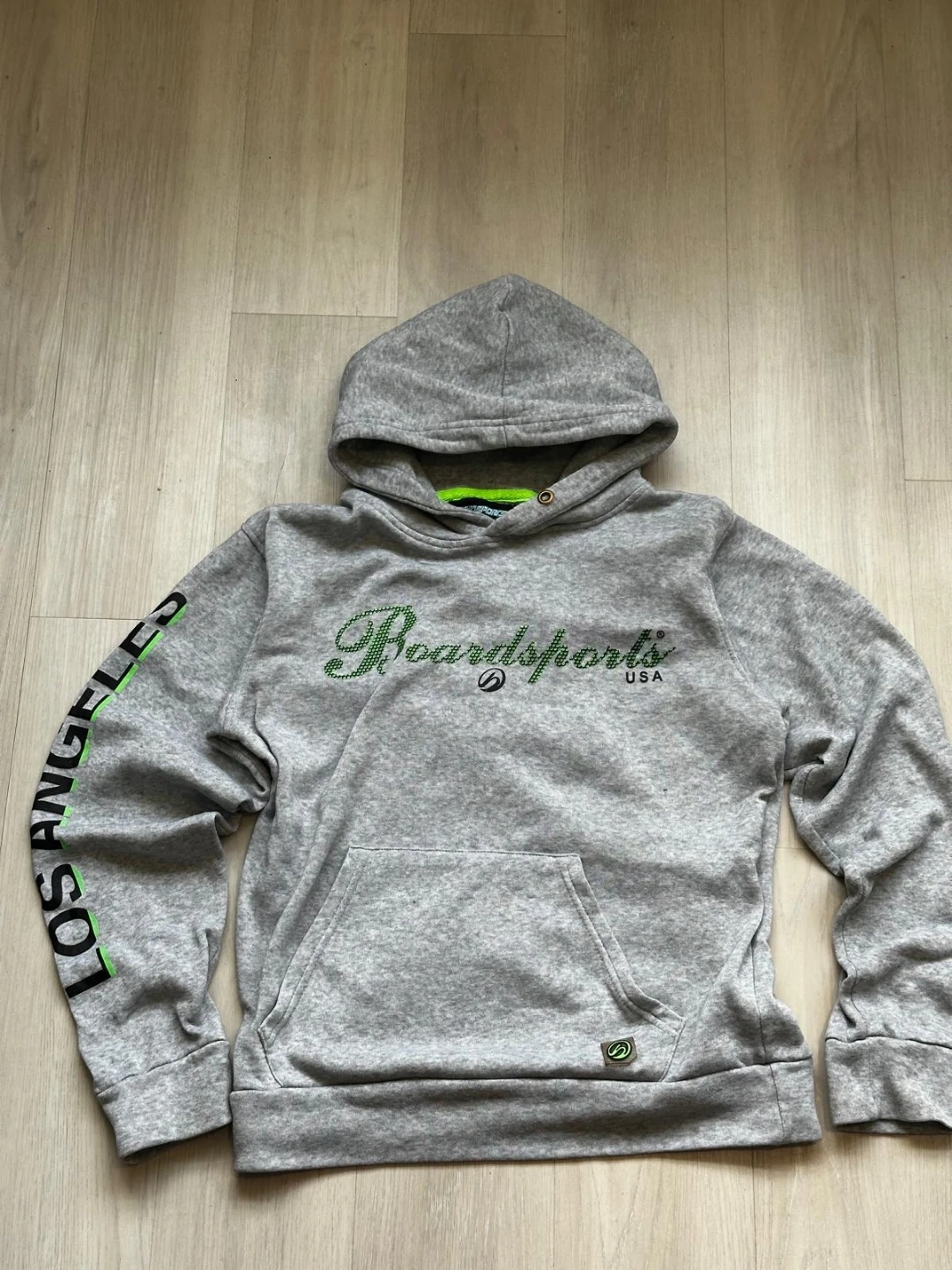Selling a grey Boardsports USA hoodie in size small. It features 'Los Angeles California' printed on the sleeves and the brand name on the front. Great for casual wear!