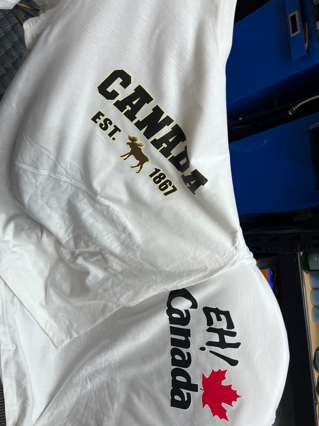 Selling a white t-shirt with a 'Canada Est. 1867' design and a moose graphic on the front, and 'Eh! Canada' with a maple leaf on the back