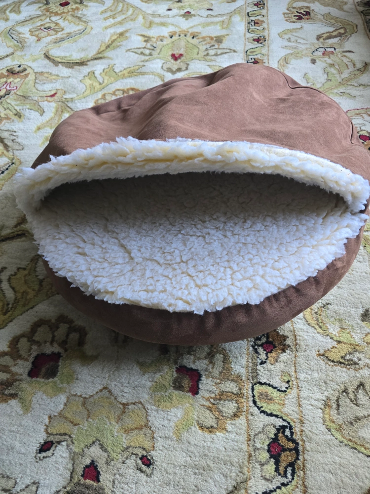 Selling a cozy brown round pet bed! It has a soft, plush interior that your furry friend will love. It's in great condition and ready for a new home. Perfect for cats or small dogs looking for a comfy place to nap