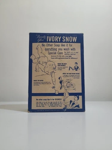 Discover a slice of vintage charm with this rare NOS (New Old Stock) 1950s Ivory Snow Soap Box, a must-have for collectors and enthusiasts of advertising memorabilia The classic ivory hue and authentic design capture the essence of a bygone era, making it an exceptional piece for display or to add depth to your collection.