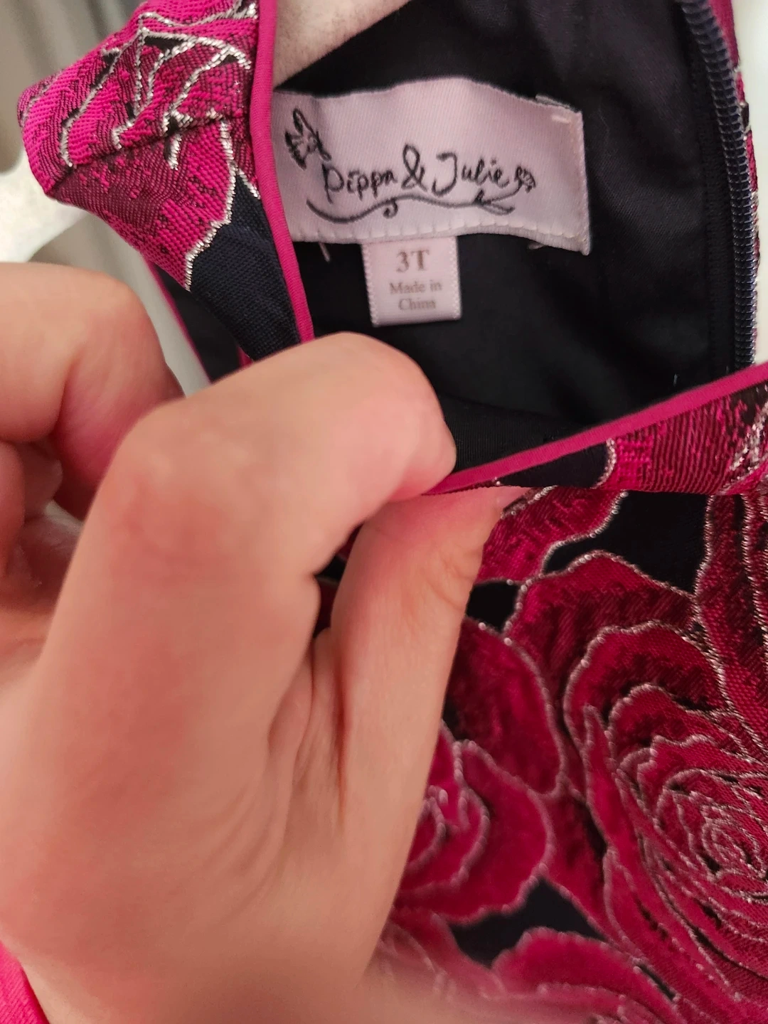 A beautiful Pippa & Julie dress in size 3T! It features a lovely rose pattern in shades of pink and silver on a black background. Perfect for a special occasion or just to make your little one feel extra fancy. Still in perfect condition