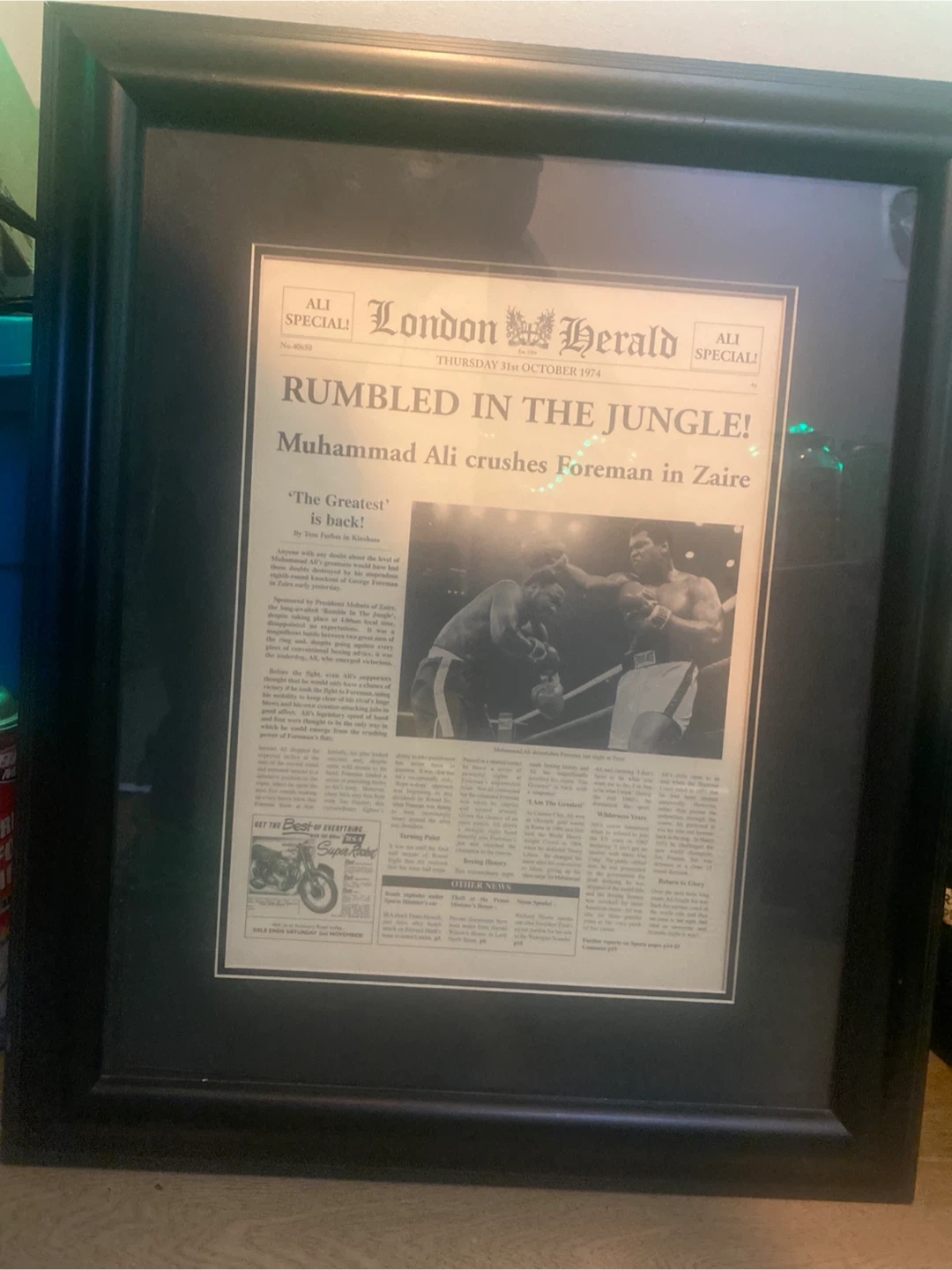 Framed London Herald newspaper featuring Muhammad Ali crushing George Foreman in Zaire! The headline reads 'Rumbled in the Jungle!' from October 31, 1974. A great piece of boxing history to add to your collection