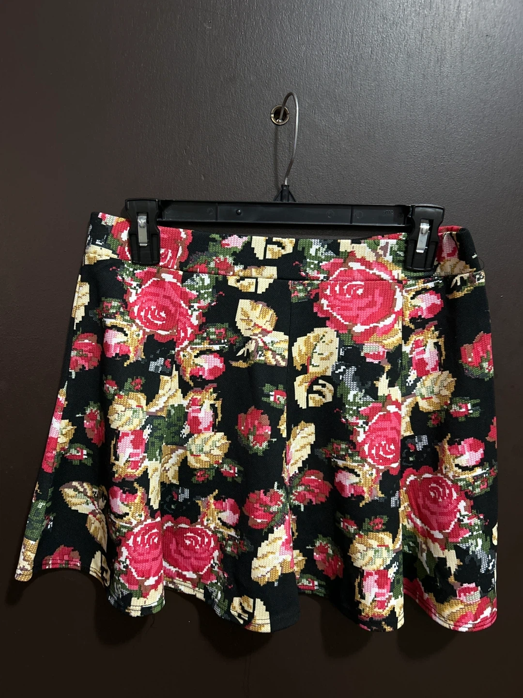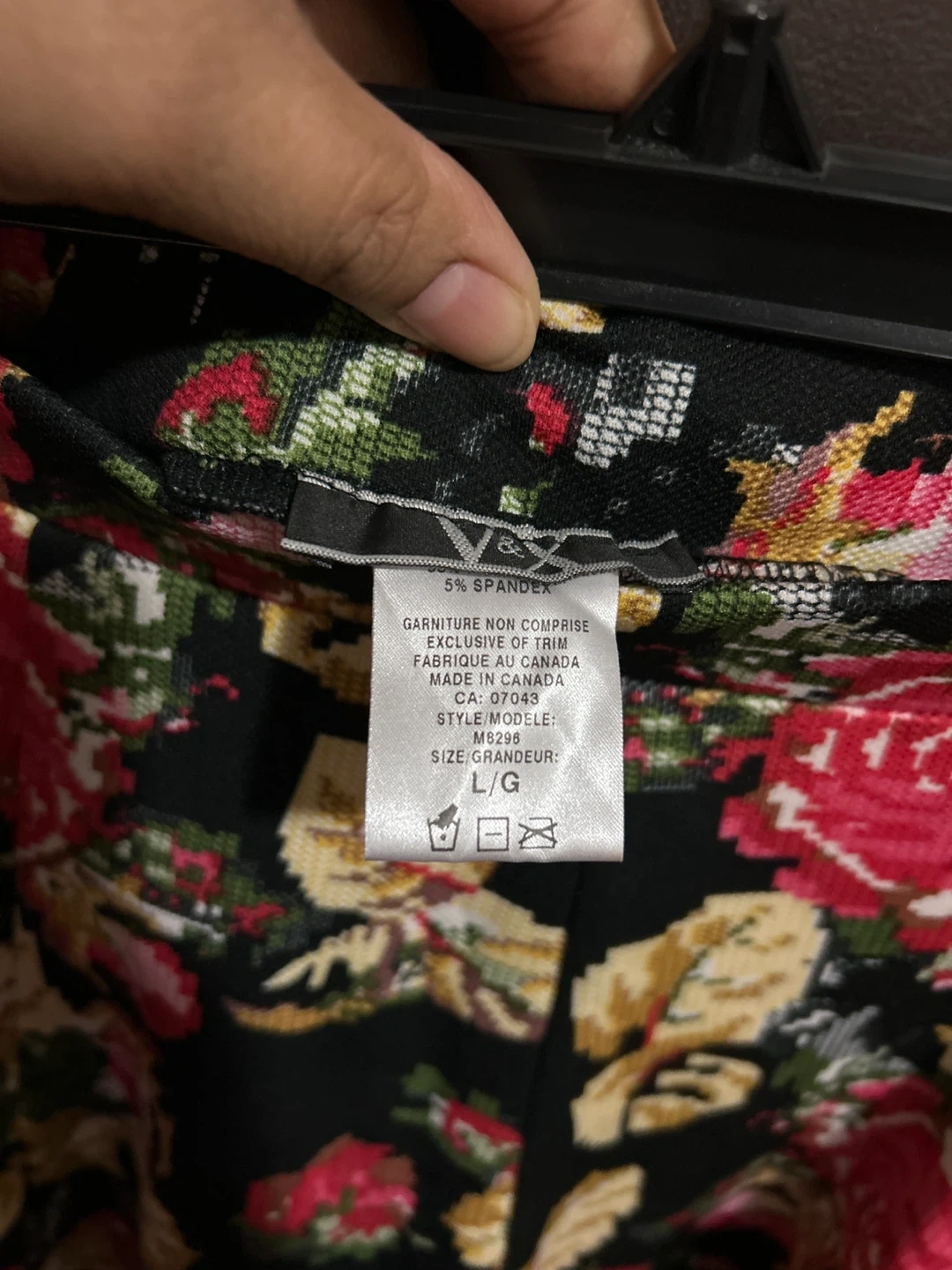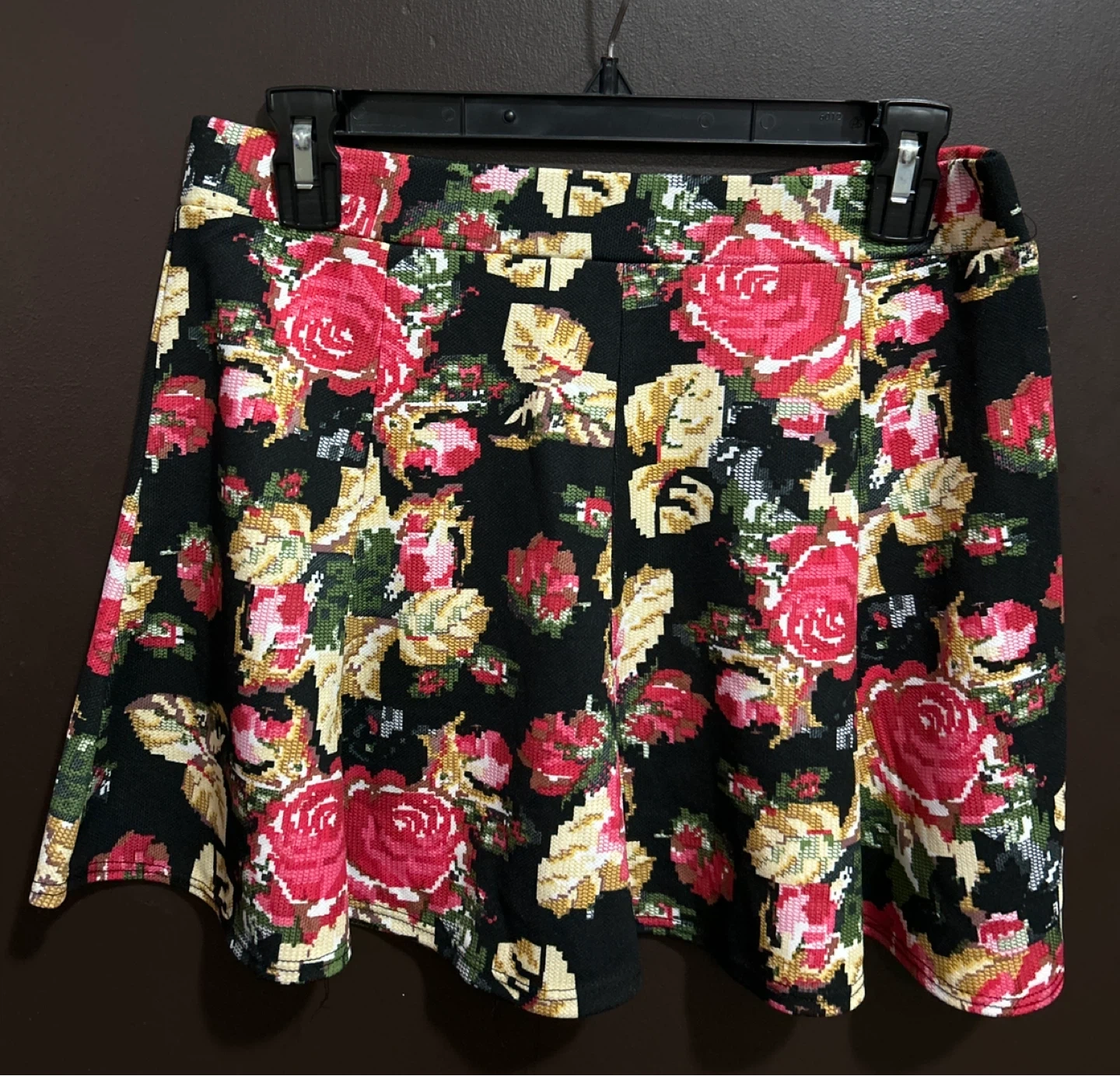 A new and Cute V&V skirt with a lovely floral pattern! It's a size large and made with 95% rayon and 5% spandex, so it's comfy and has a bit of stretch to it