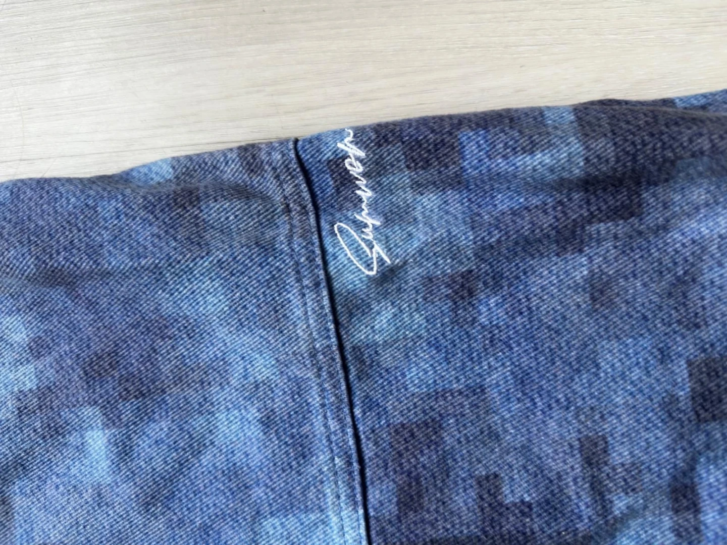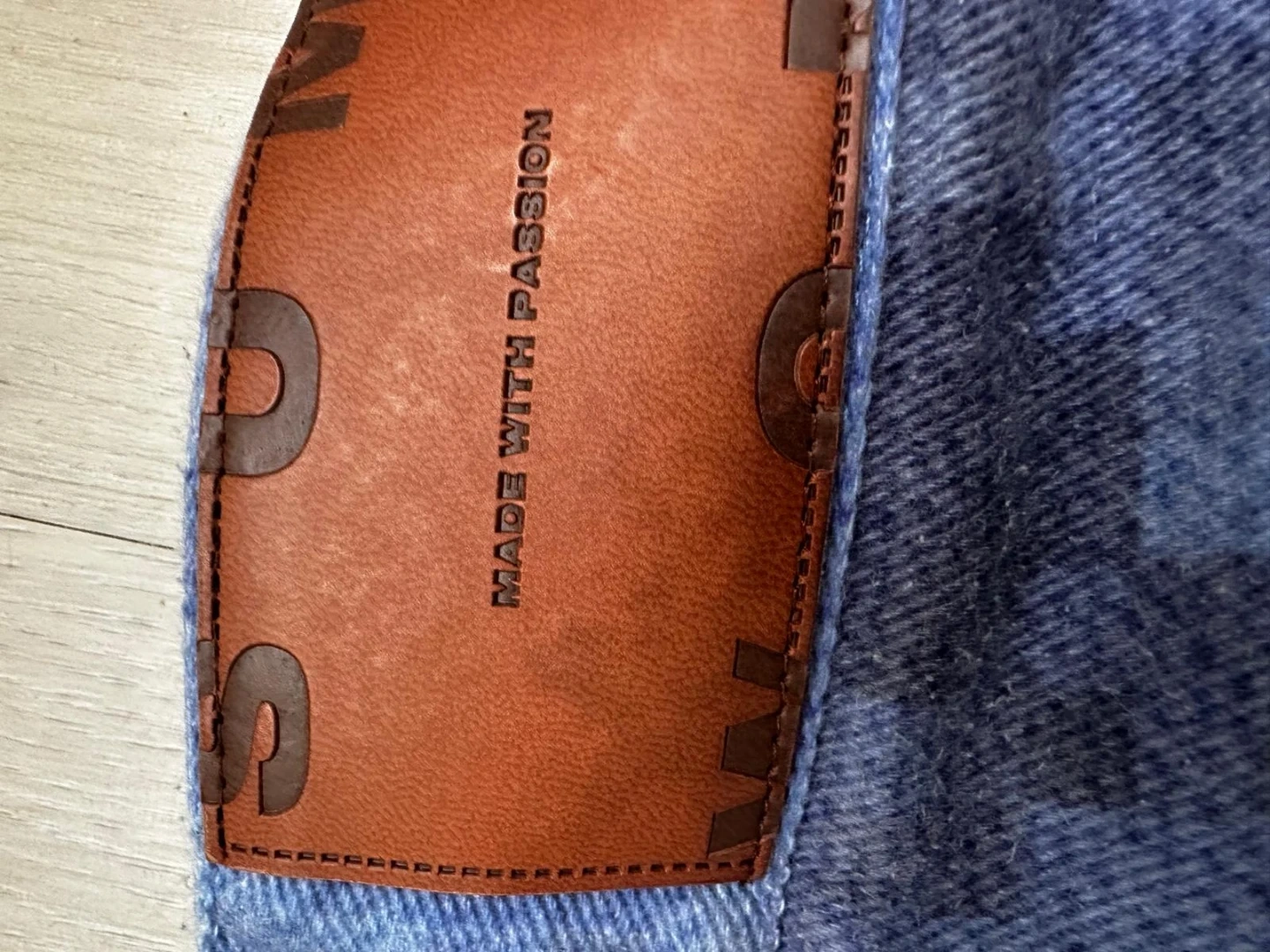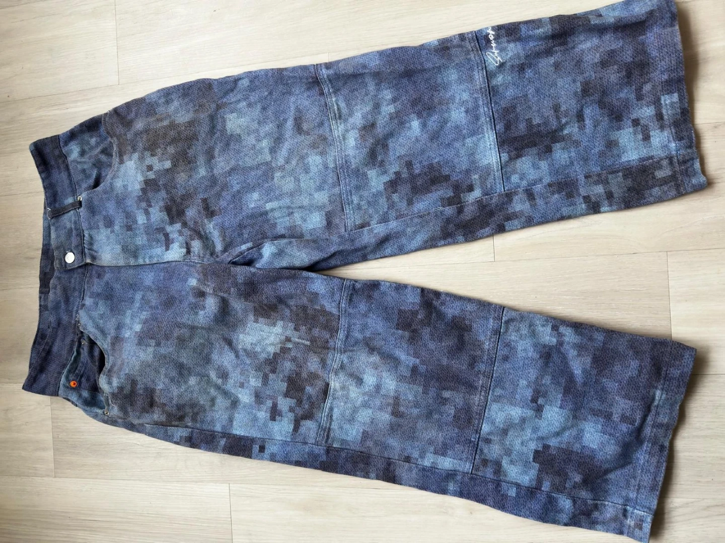 carpenter pants. They feature a unique blue camo design. The back has a brown leather patch that says 'Made with Passion'.