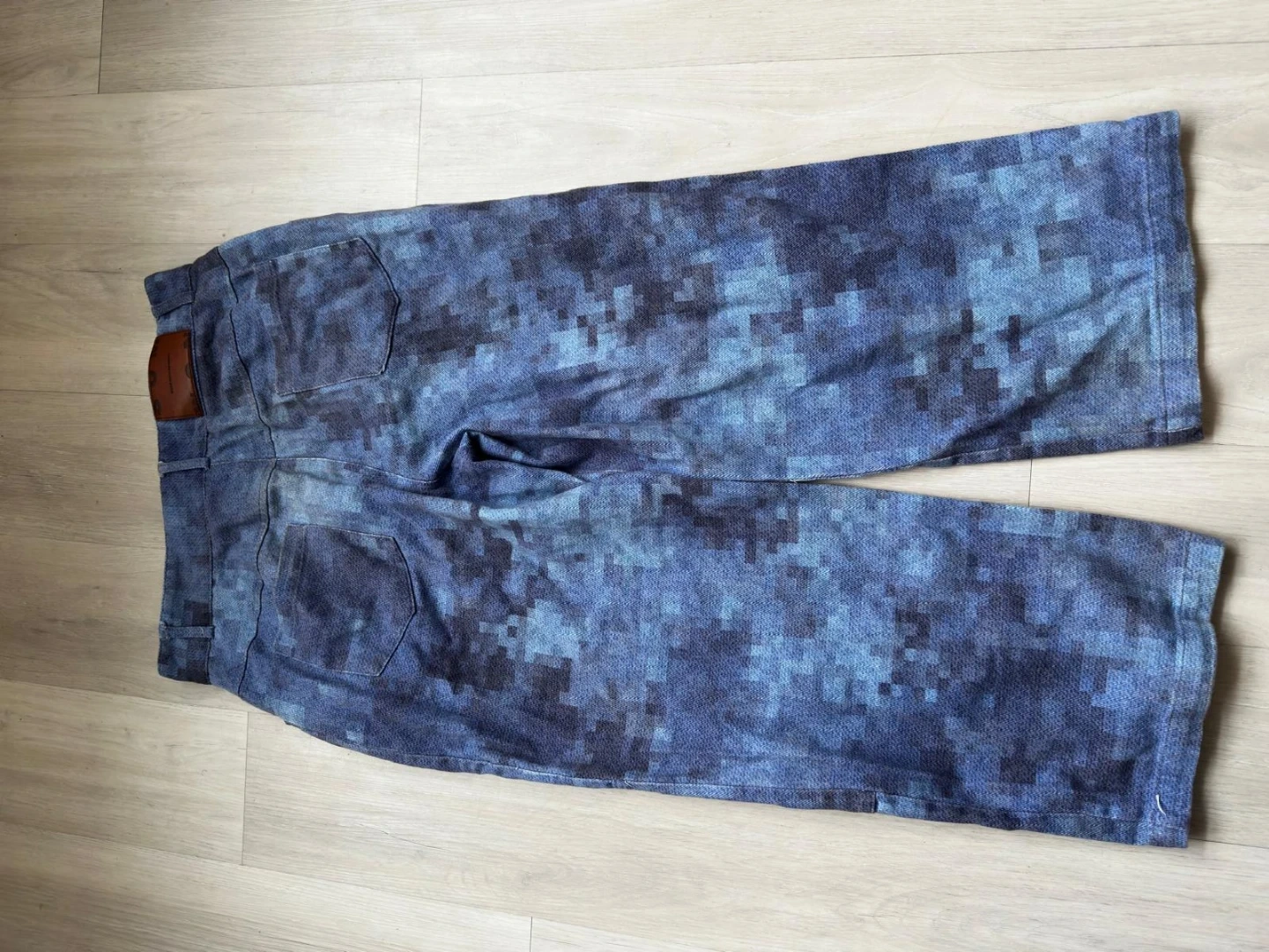 carpenter pants. They feature a unique blue camo design. The back has a brown leather patch that says 'Made with Passion'.