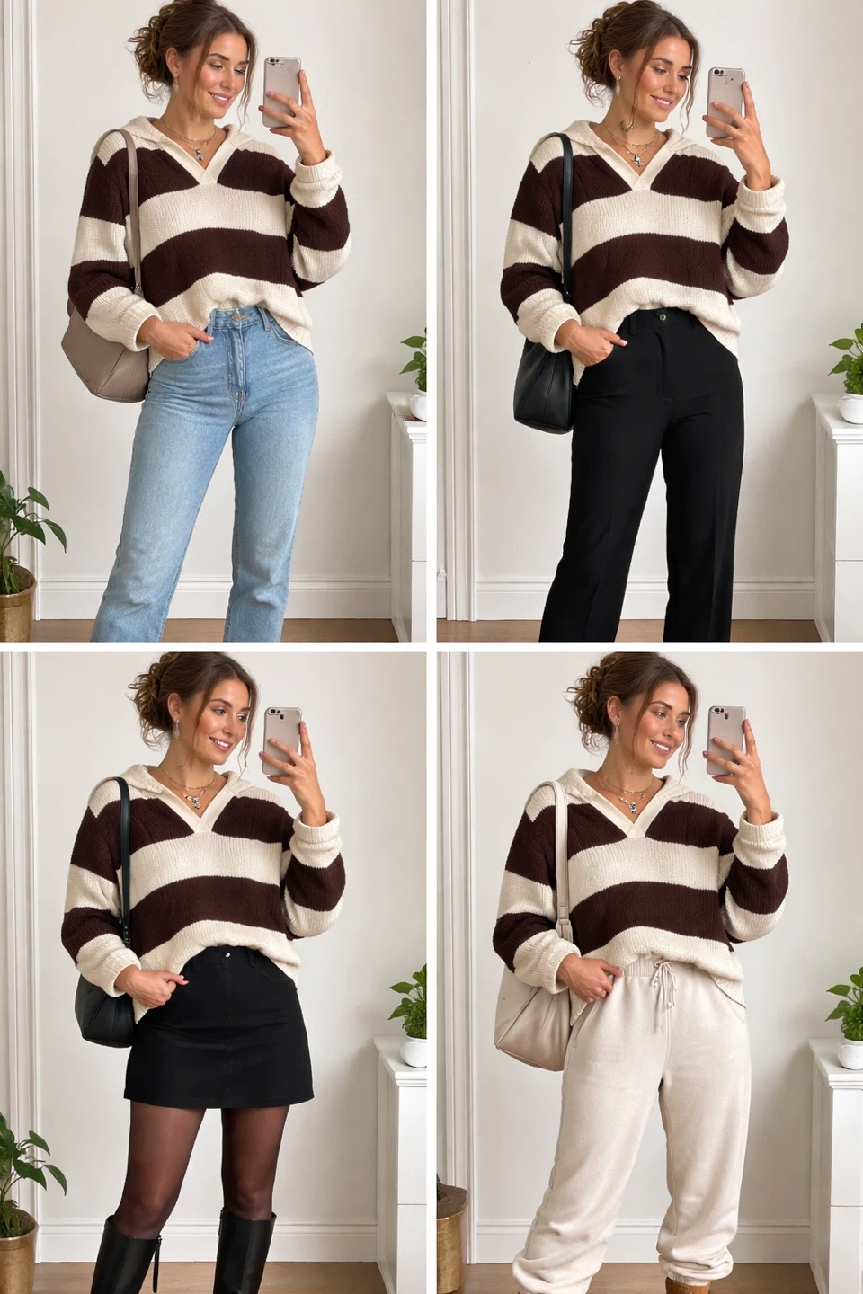 Cozy striped knit polo sweater with a relaxed fit! Perfect for layering or wearing on its own. The brown and cream stripes are super stylish and versatile