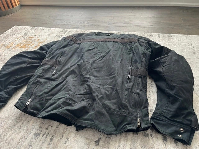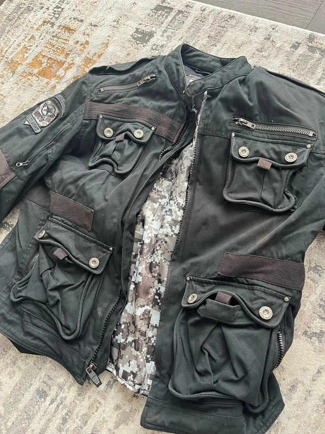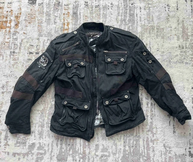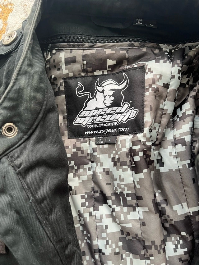I'm selling a used Speed Strength jacket, a blend of style and function. This jacket features multiple pockets and zipper details. This jacket has been previously worn and has signs of wear, which adds to its character.