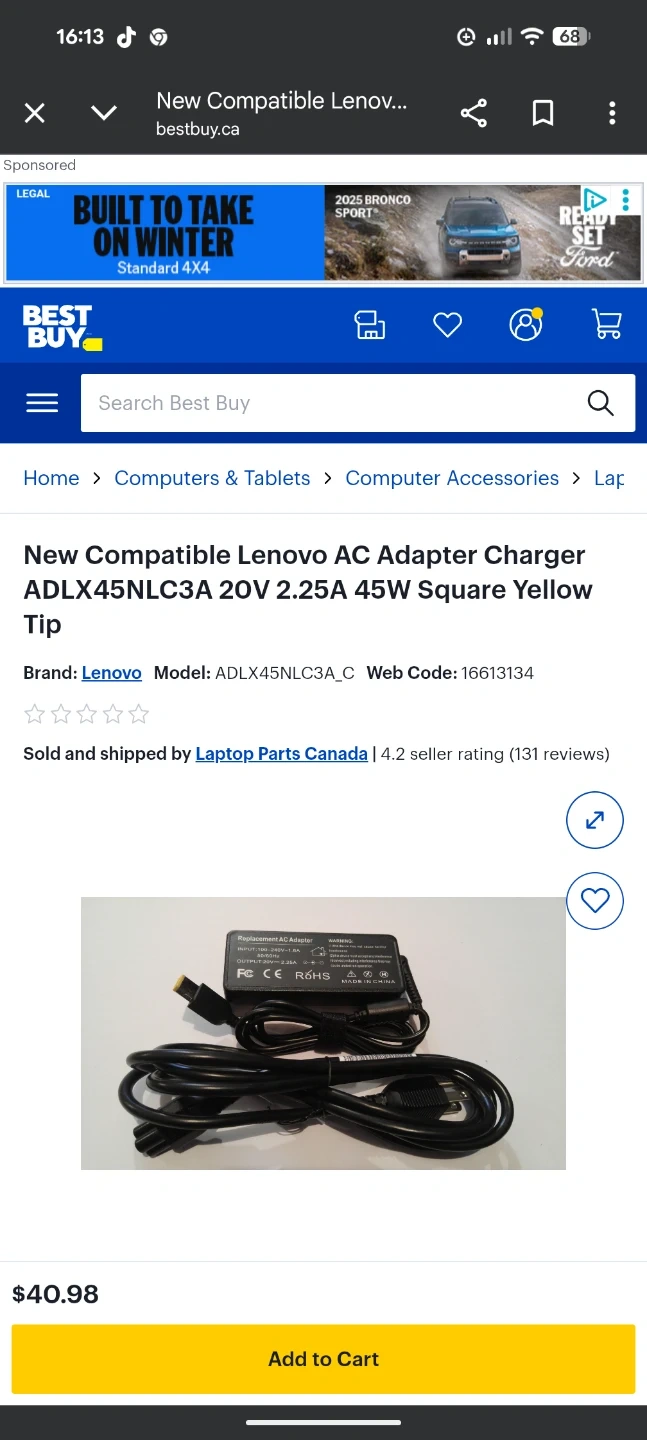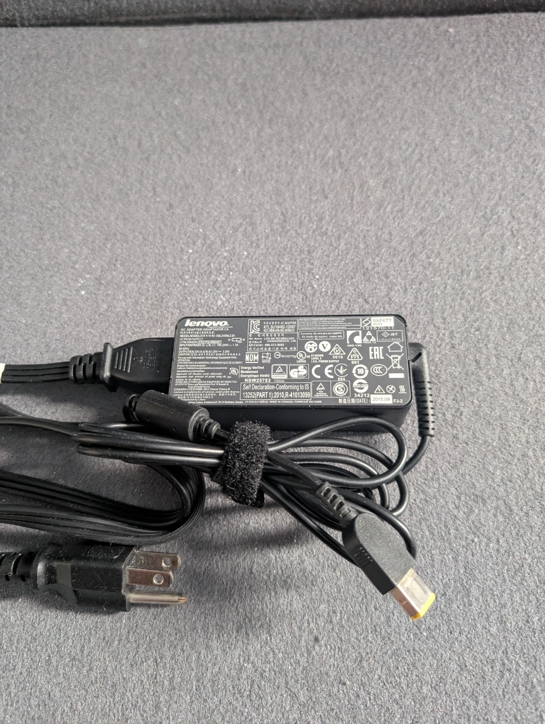Selling a Lenovo 45W AC Power Adapter/Charger, model ADLX45NLC3A. It features a square yellow tip and is compatible with many Lenovo laptops, including ThinkPad, IdeaPad, Yoga, and Flex models. It has a 20V output and requires users to match the yellow tip for proper function. The power output is 45W (20V / 2.25A) and the input is 100-240V ~ 1.2A 50-60Hz