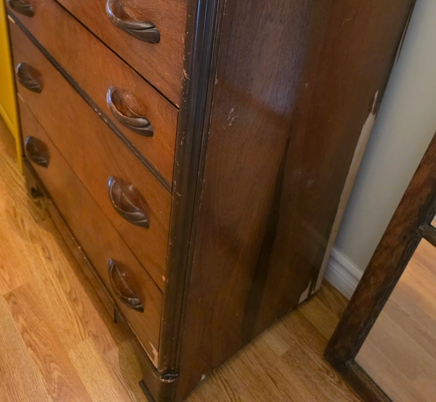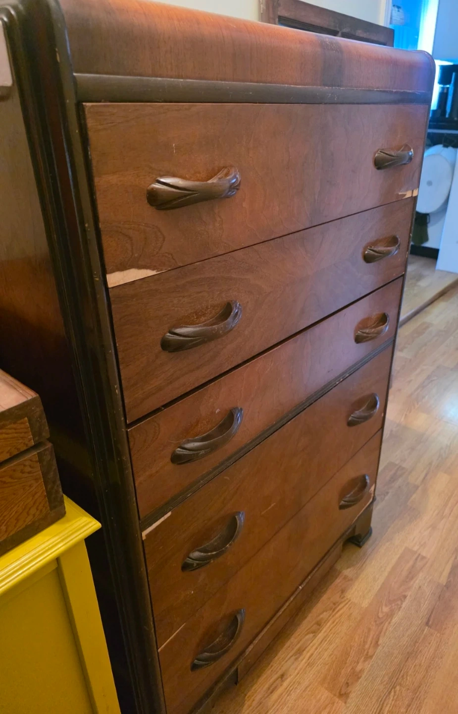 A treasure that was once my grandfathers. I"m renovating and it's time to part with it. Vintage wooden dresser. It has some wear and tear, as shown in the photos, but it's still a solid piece of furniture. The dresser features five drawers, providing ample storage space. Some TLC and it would be a great piece. Purchased by my grandfather at Thomas furniture (see label)