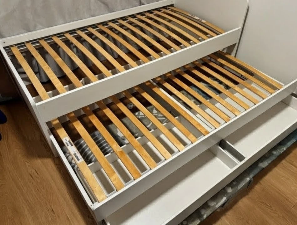 Selling an IKEA daybed frame in white! It features a pull-out section to make a queen sized bed, plus 2 spacious drawers for storage. Perfect for a guest room or a kid's room