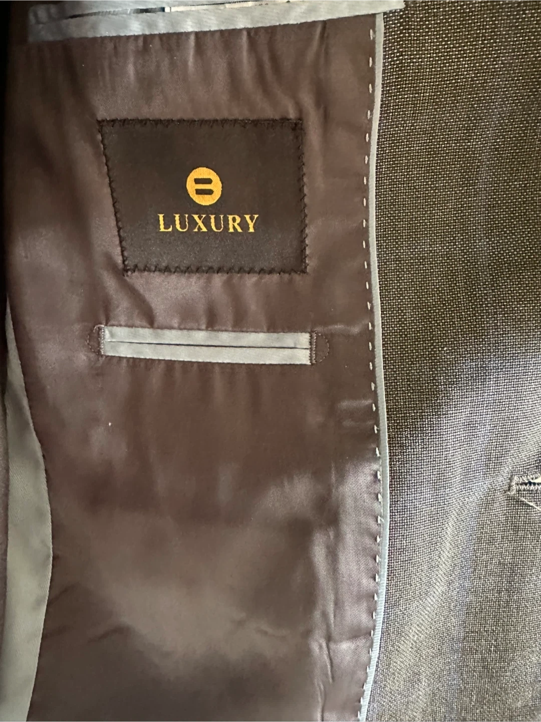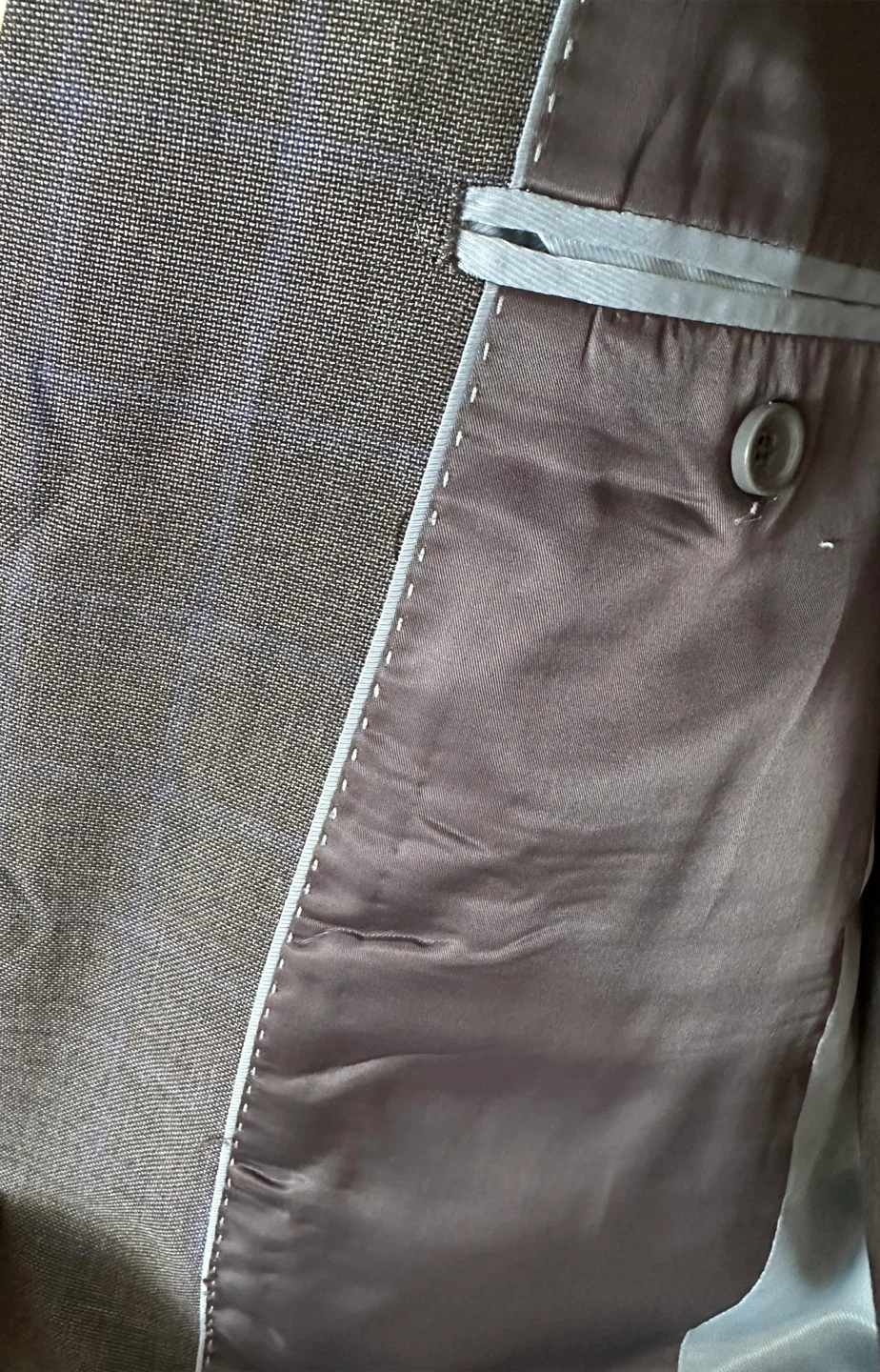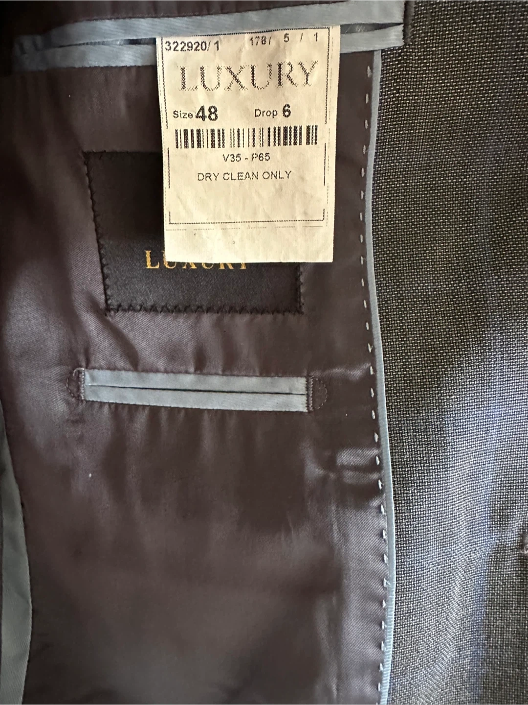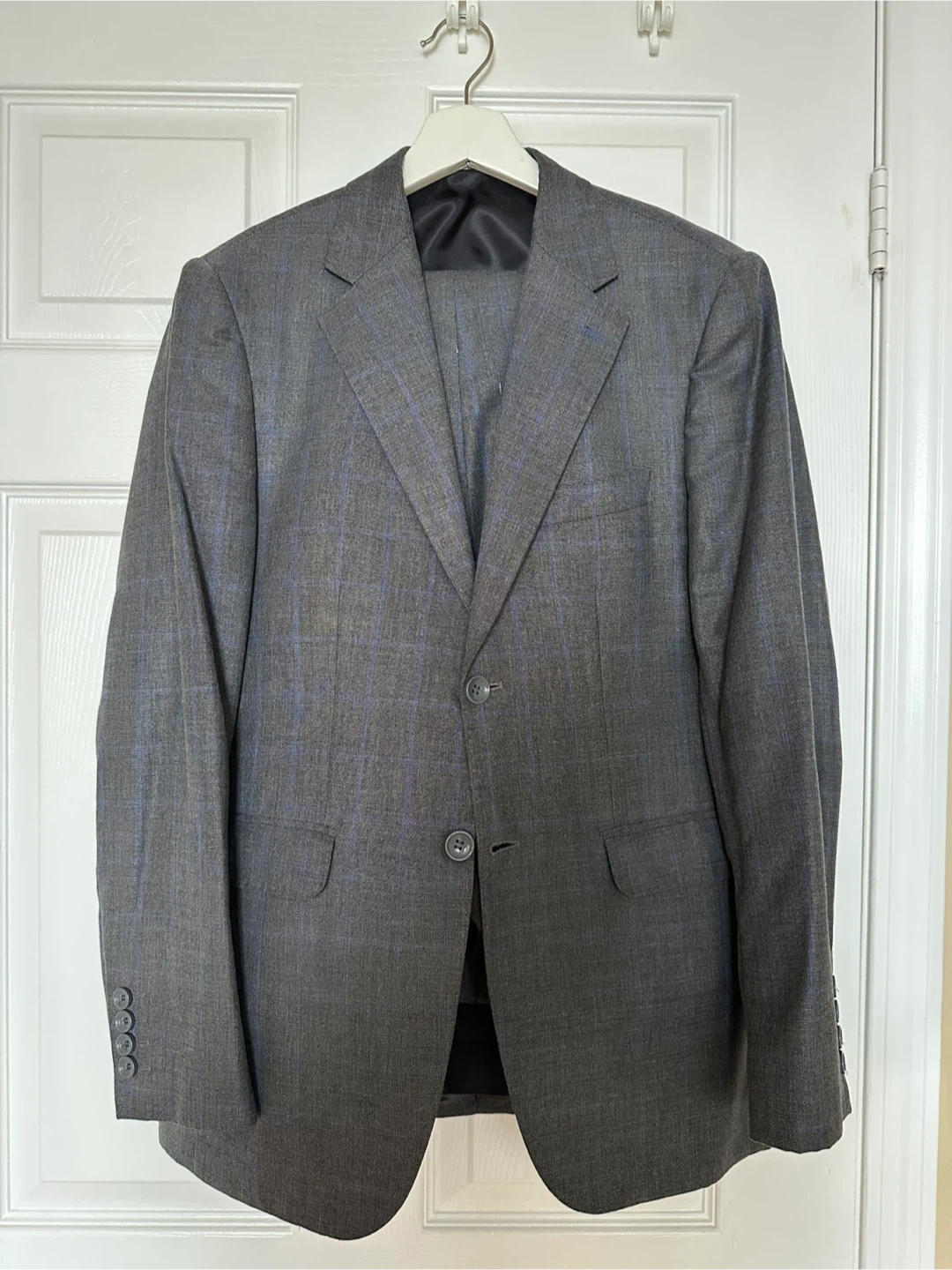 Grey men's suit. Absolutely clean and like new. Size 48, drop 6. Dry clean only. Subtle check gray and blue pattern. Two-button closure.