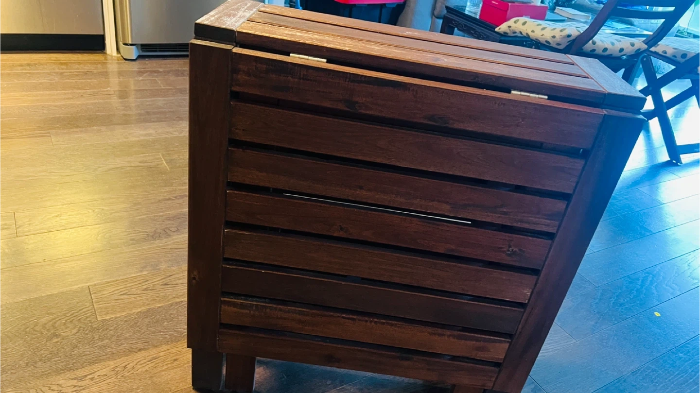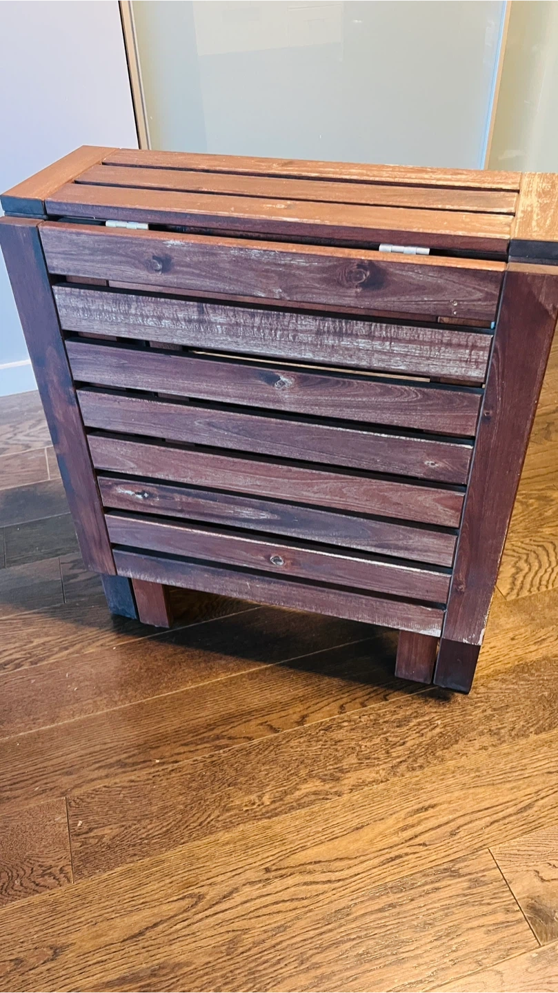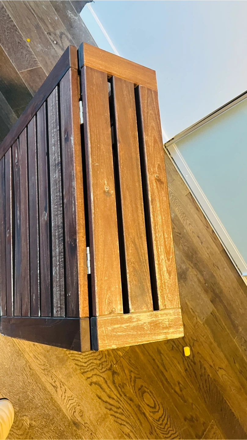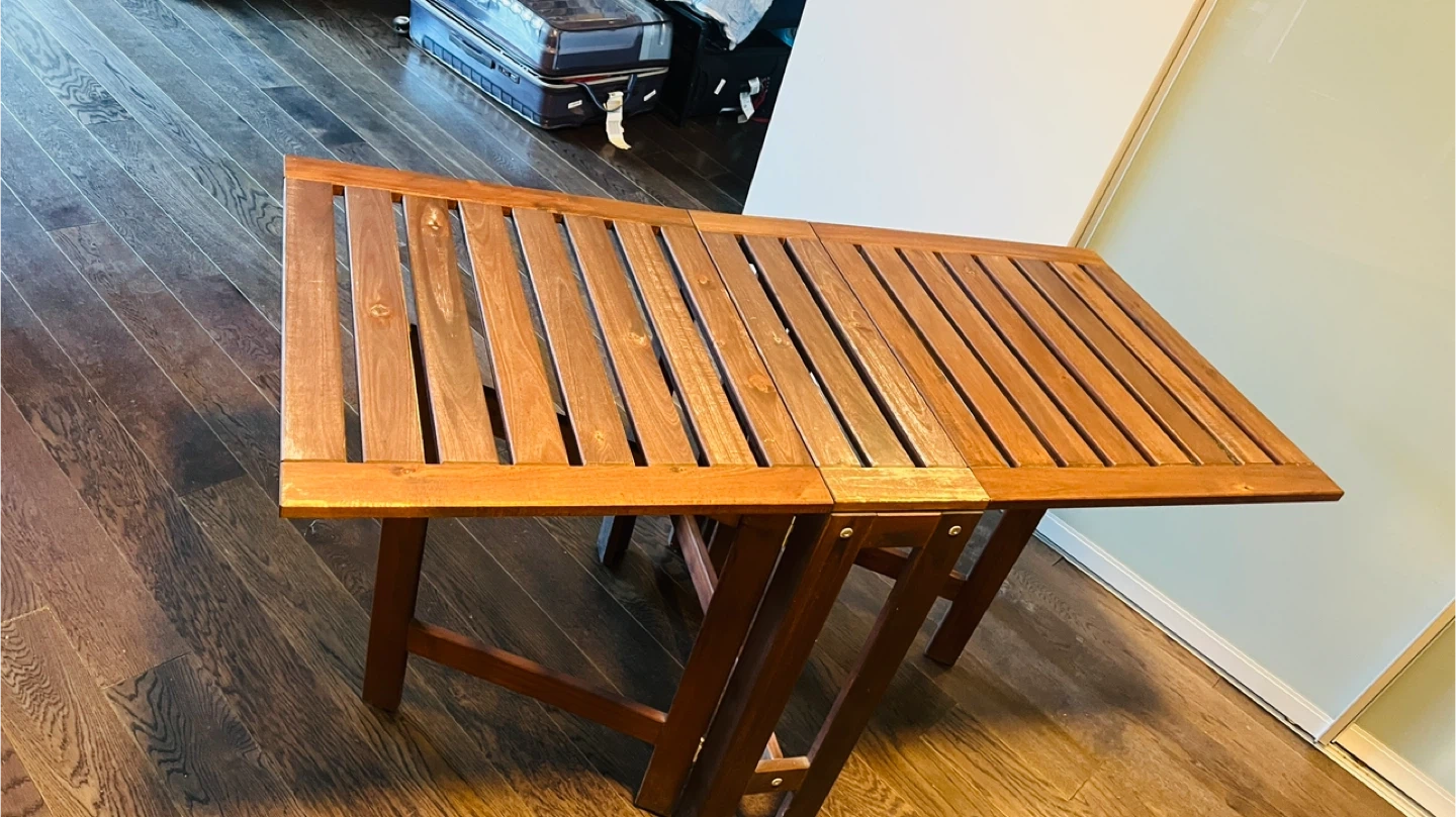 Selling a foldable wooden table and chair set, perfect for a balcony or small space. The set includes a table with a drop-leaf extension and two matching chairs with cushions. Great for enjoying a meal or relaxing outdoors!