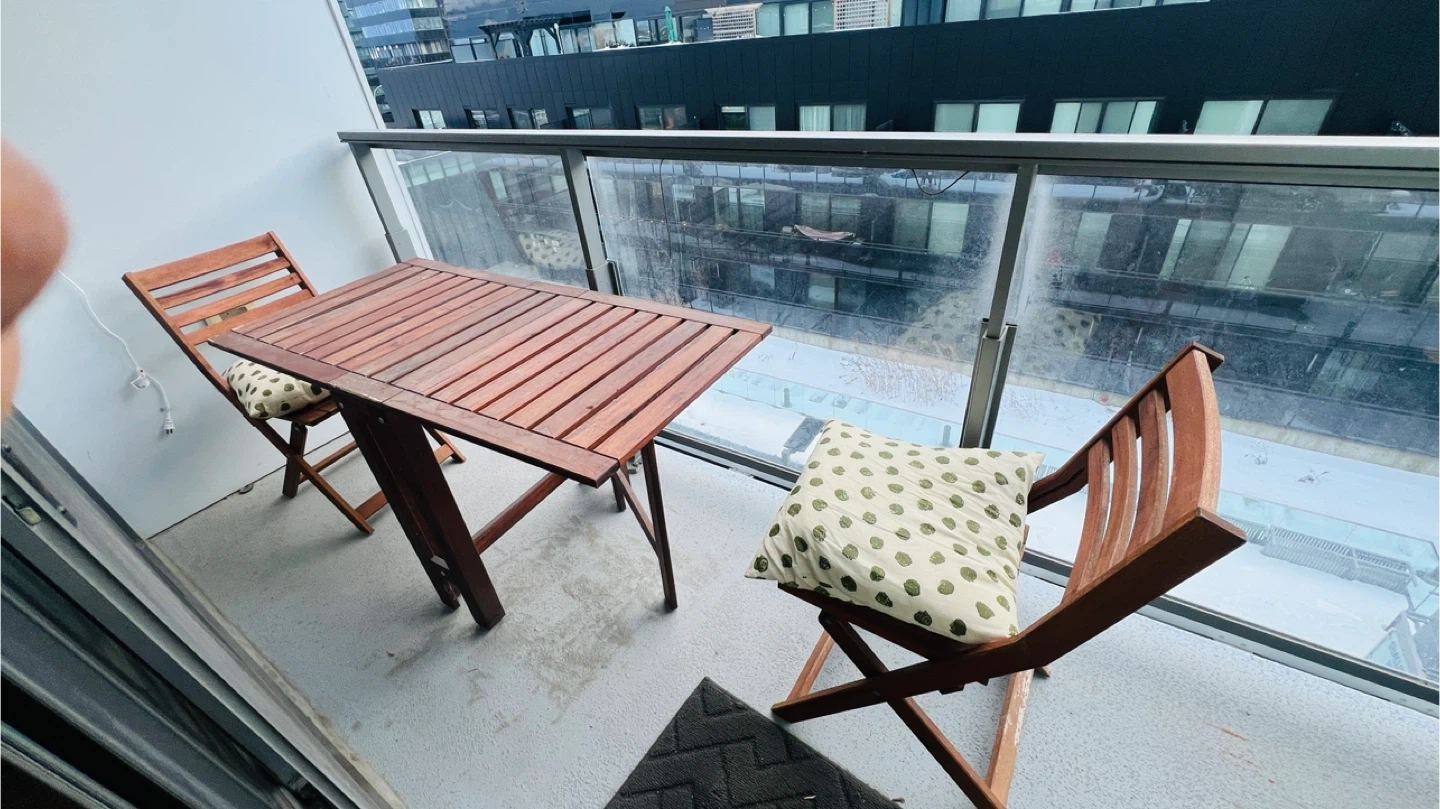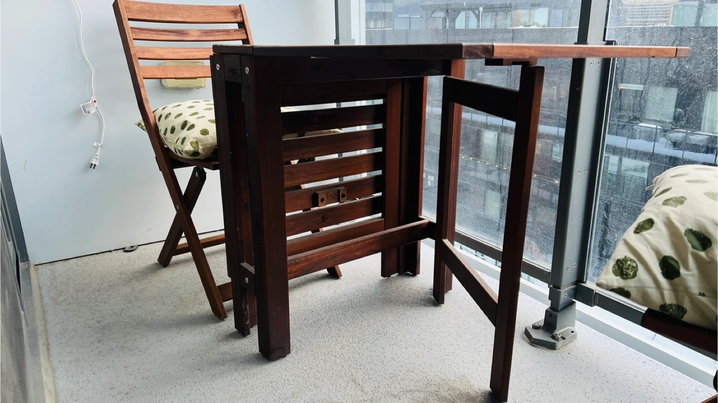 Selling a foldable wooden table and chair set, perfect for a balcony or small space. The set includes a table with a drop-leaf extension and two matching chairs with cushions. Great for enjoying a meal or relaxing outdoors!