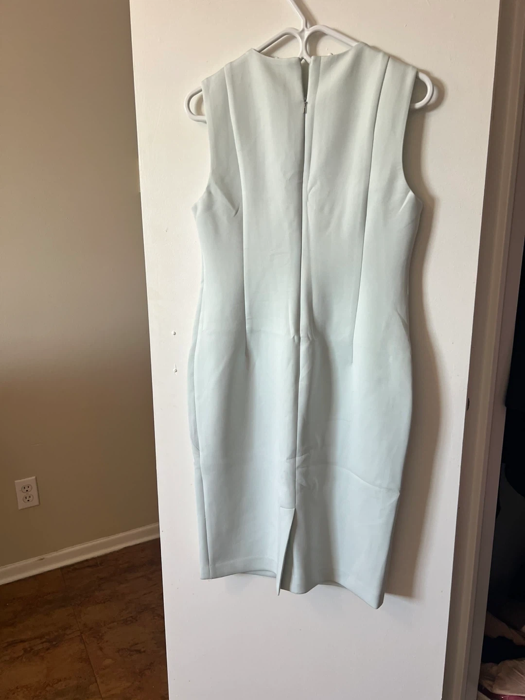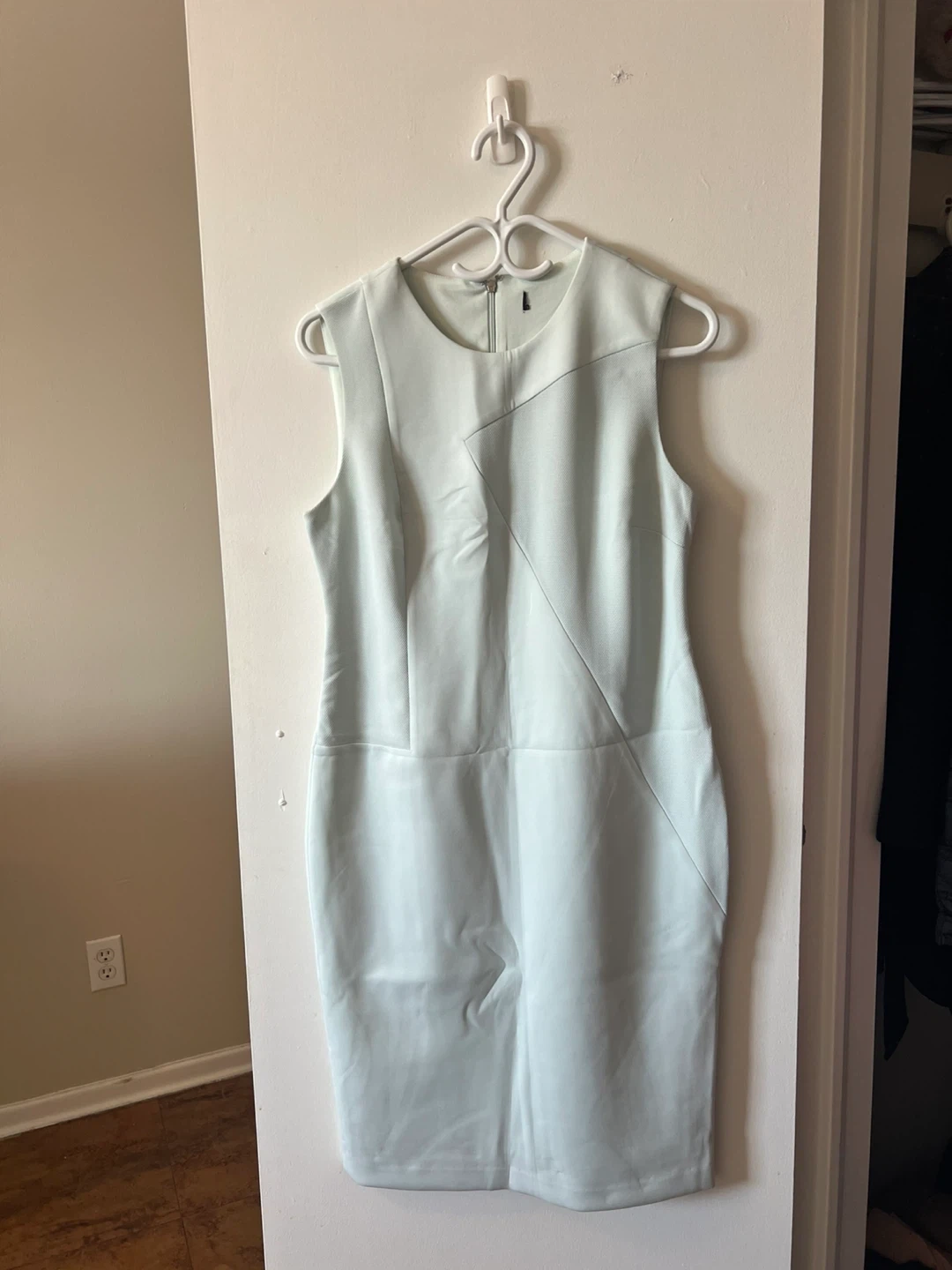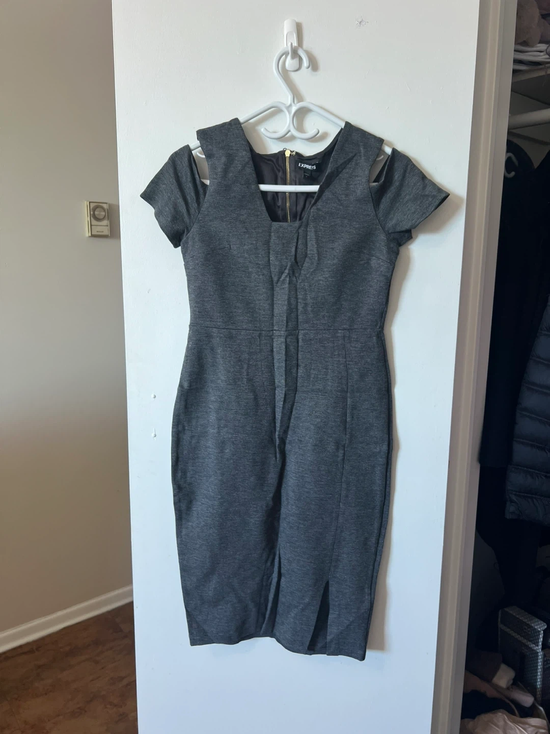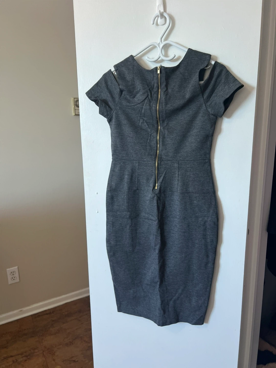 Two bodycon dresses for sale! One is grey with short sleeves and shoulder cutouts, and the other is a light blue sleeveless dress with cut in the back,