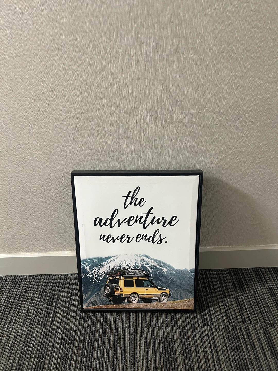 A framed piece of wall art featuring a yellow SUV with the words "The adventure never ends" written above it. It's in great condition and ready to add some character to your space!