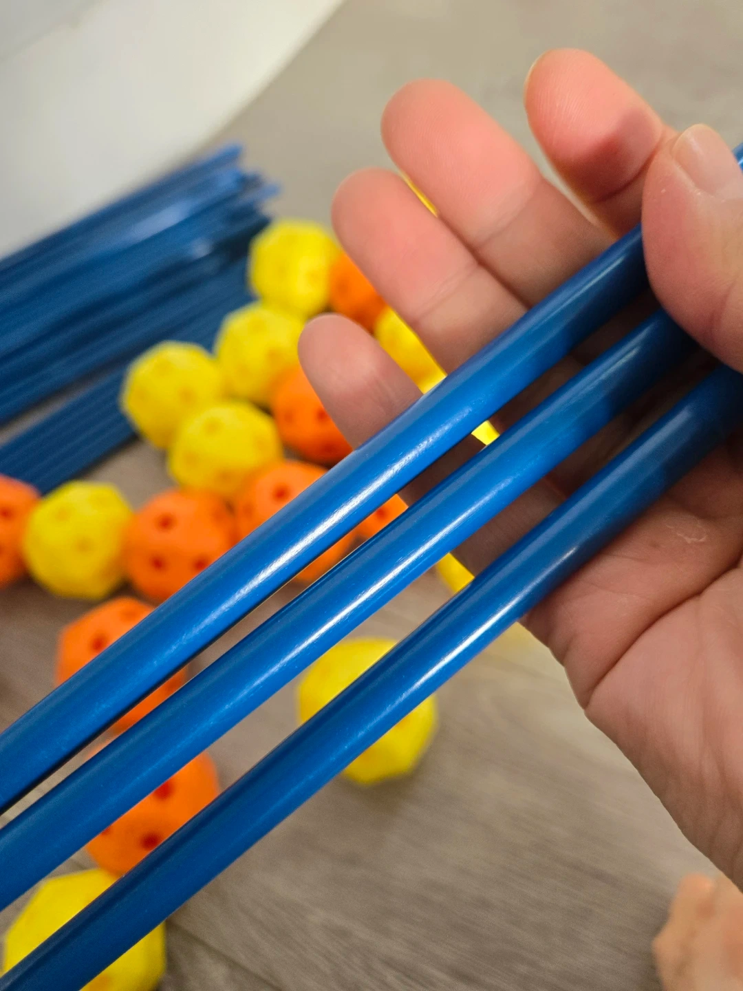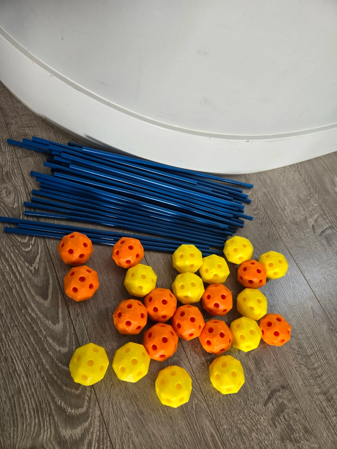 Comes eith 23 balls and 43 sticks. Can be added to other crazy fort set to make bigger structures.