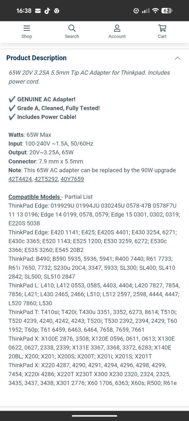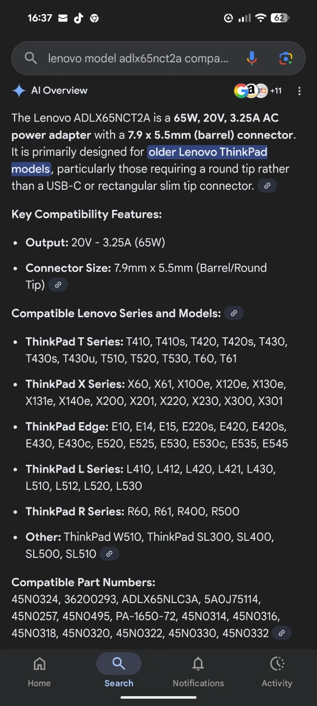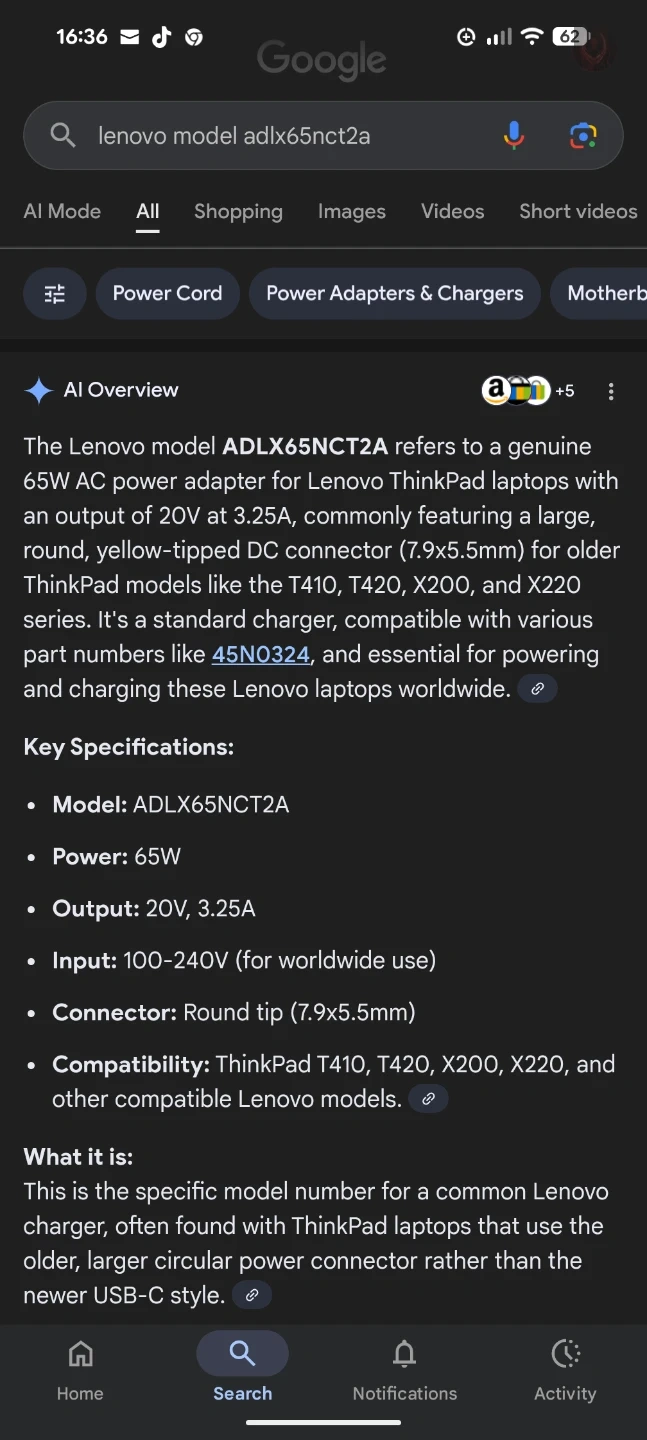 Selling a Lenovo 65W AC Adapter, model ADLX65NCT2A. This power adapter is compatible with older Lenovo ThinkPad models that require a round tip connector.