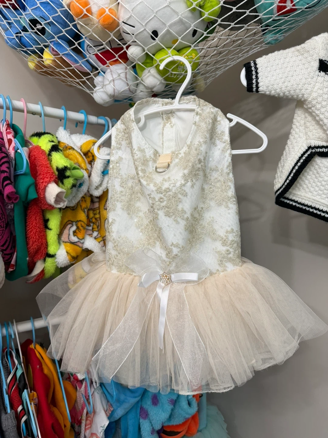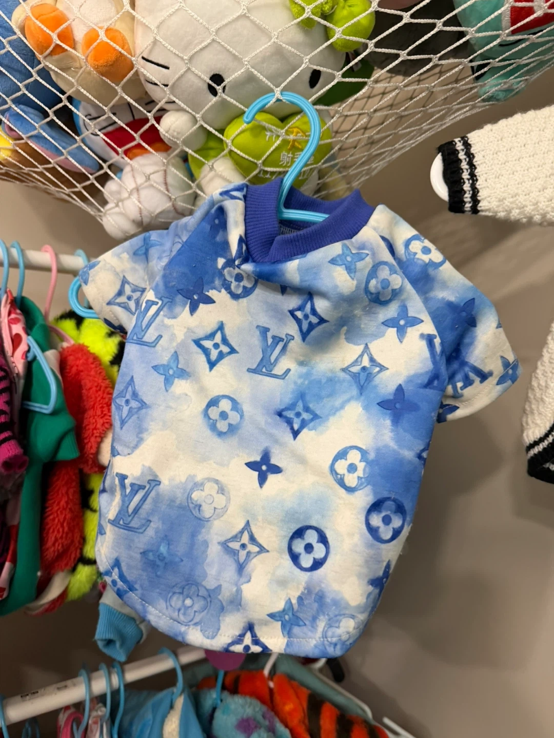 Selling a collection of designer dog clothes. Includes brands like Balenciaga (green), Louis Vuitton (blue), Gucci (blue), and Chanel (white). They're all in great condition and ready for your fashionable furry friend