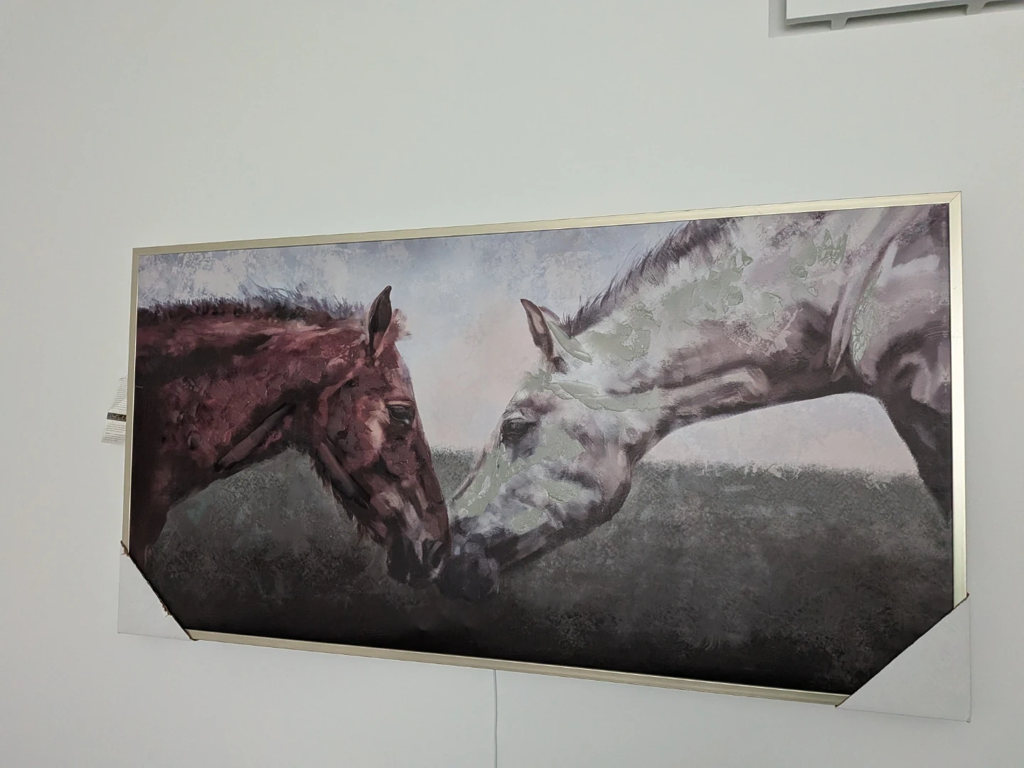 A beautiful horse art in a sleek frame! It would look great in any room of your home. The colours are neutral and calming, perfect for creating a relaxing atmosphere