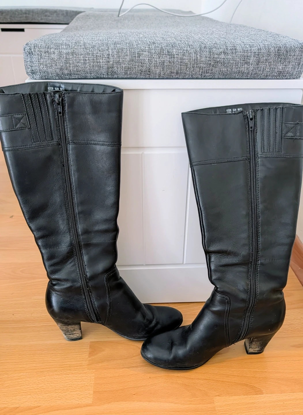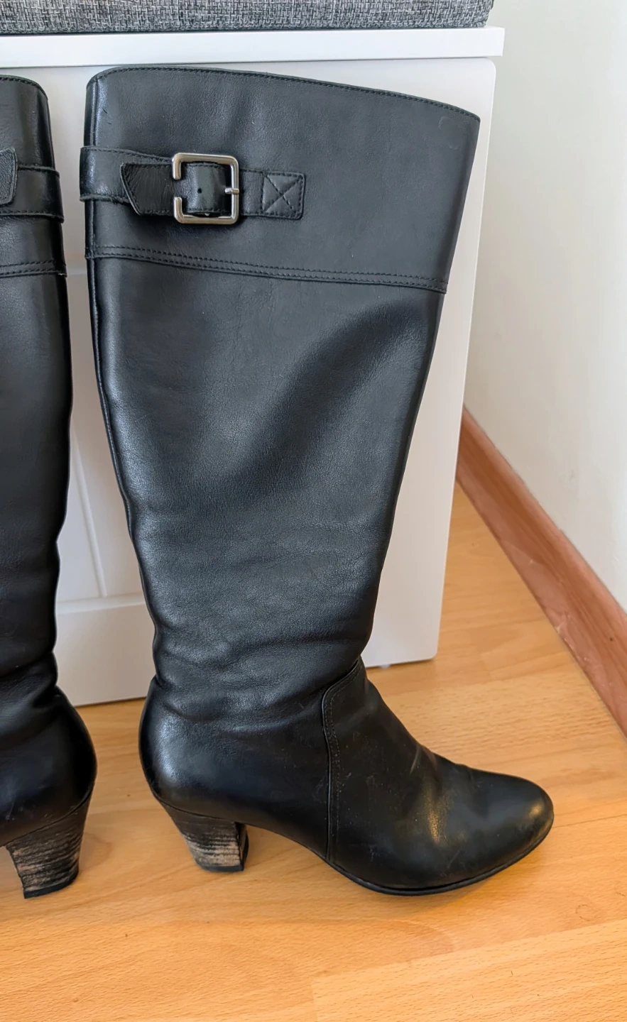 Selling a pair of Clarks knee-high boots in black leather. They are a size 6.5M. The boots feature a zipper closure and a decorative buckle at the top. The upper is made of leather, and the sole is man-made. They are in excellent condition.