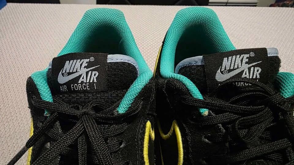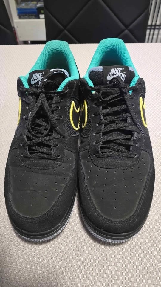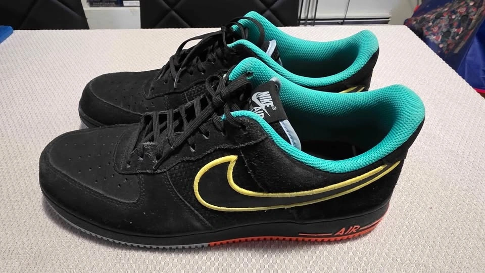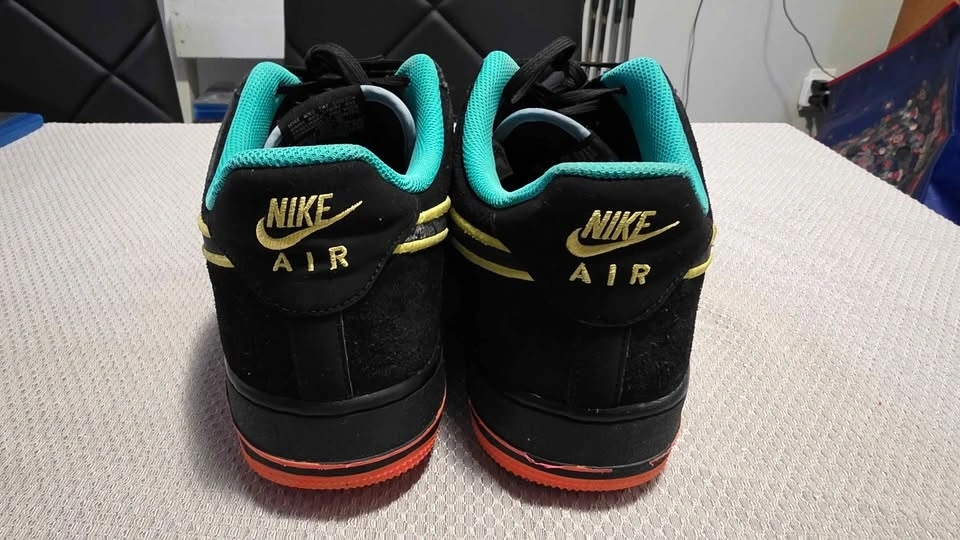 This is a Nike Air Force 1 '07 LV8 'Peace and Unity' sneaker in black, aluminum, hyper crimson, and yellow strike. In fantastic shape. Genuine. Size 11.5 mens.