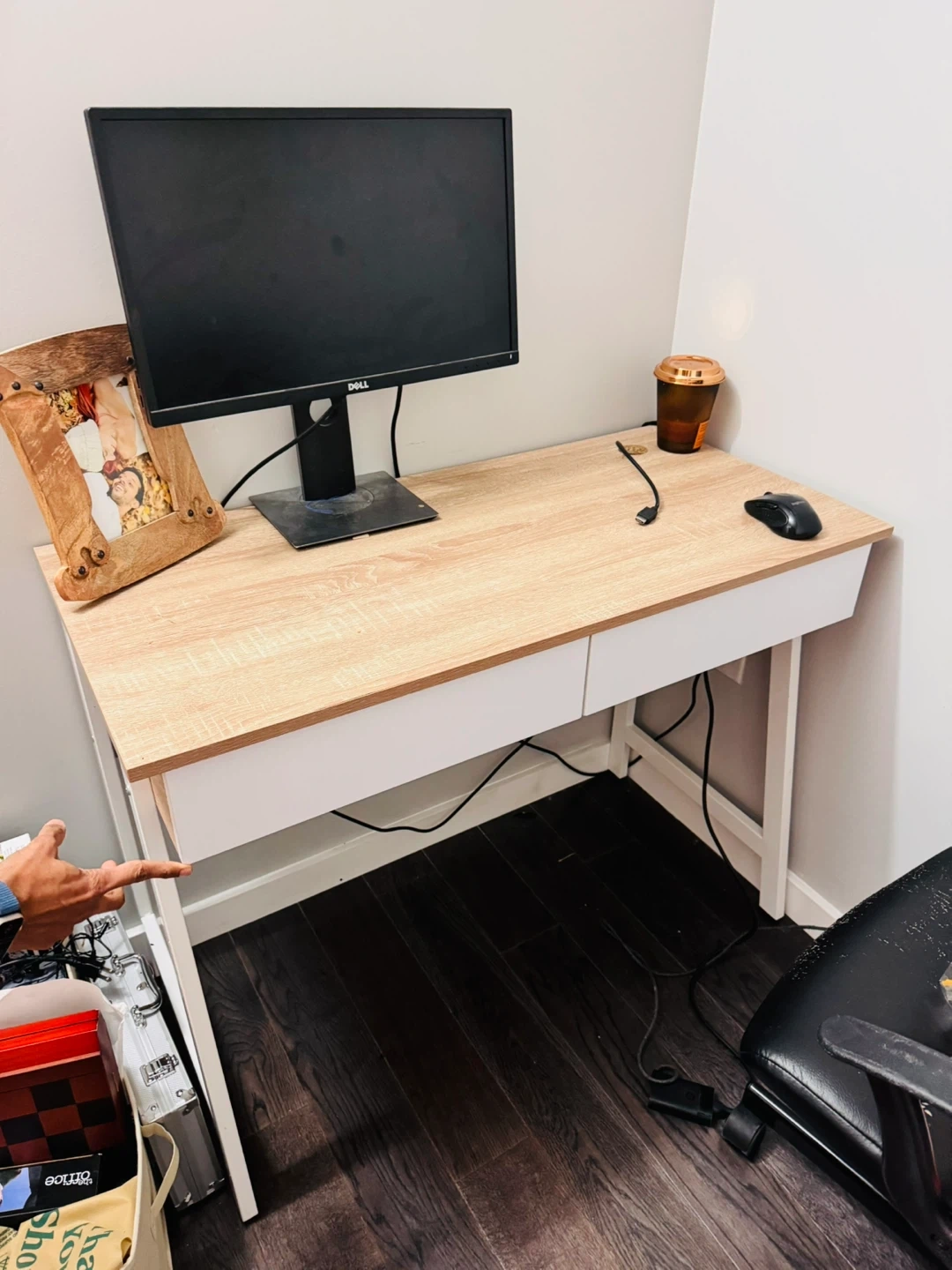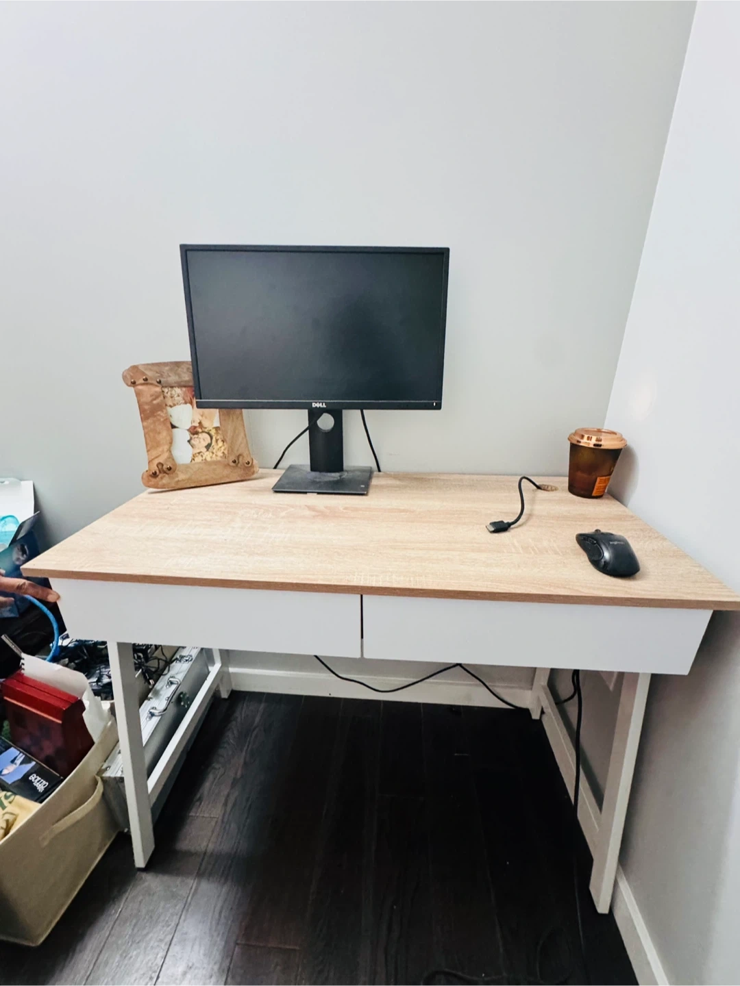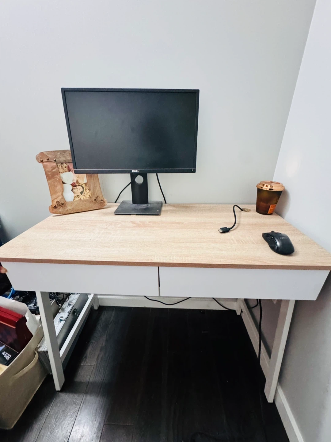 Selling a desk that's perfect for a home office or study space! It features a clean design with white legs and a light wood-tone top. The desk also has built-in drawers for convenient storage