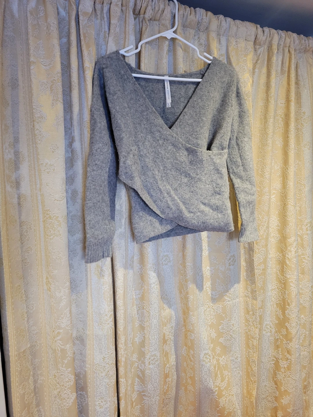 Selling a cozy grey wrap sweater from Babaton's The Group line! It's a size small and in great condition. Perfect for layering or wearing on its own for a stylish and comfortable look
