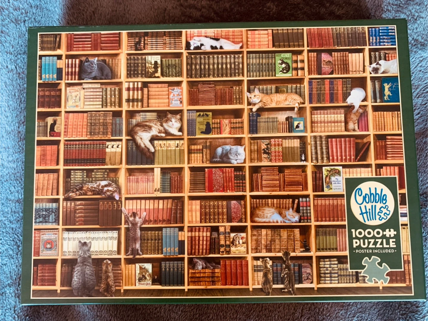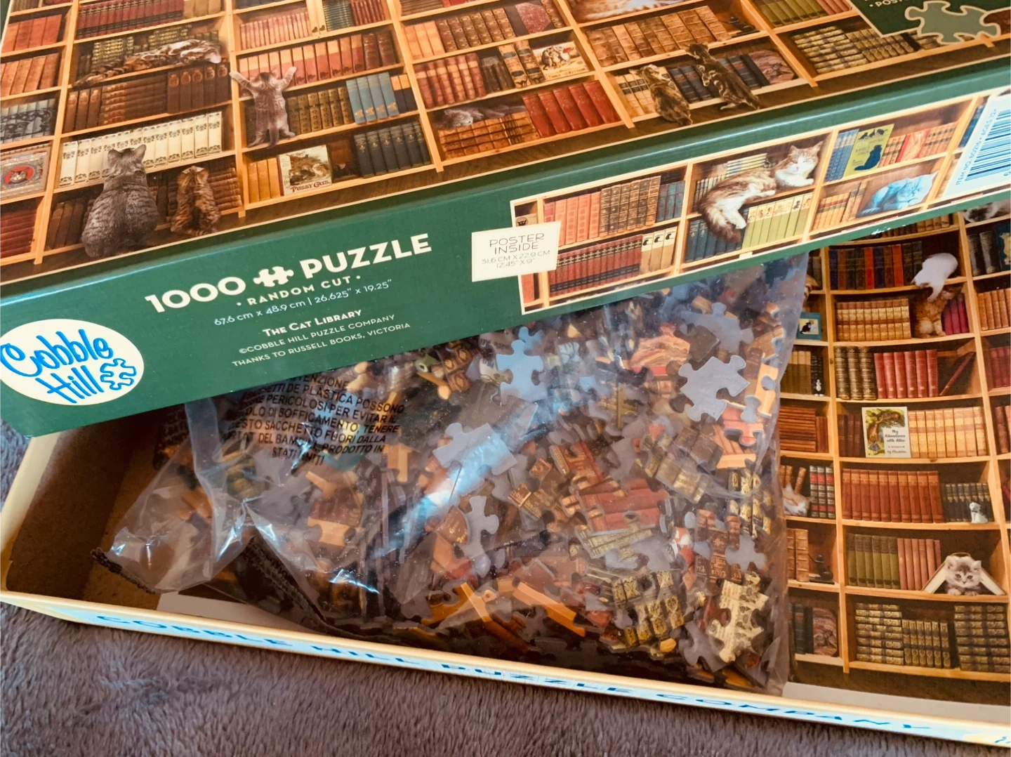 Selling a Cobble Hill 1000-piece puzzle called "The Cat Library"; based on a bookshelf from The Russell Books store in Victoria. It features a random cut and comes with a poster included. The assembled puzzle measures 67.6 cm x 48.9 cm (26.625" x 19.25").