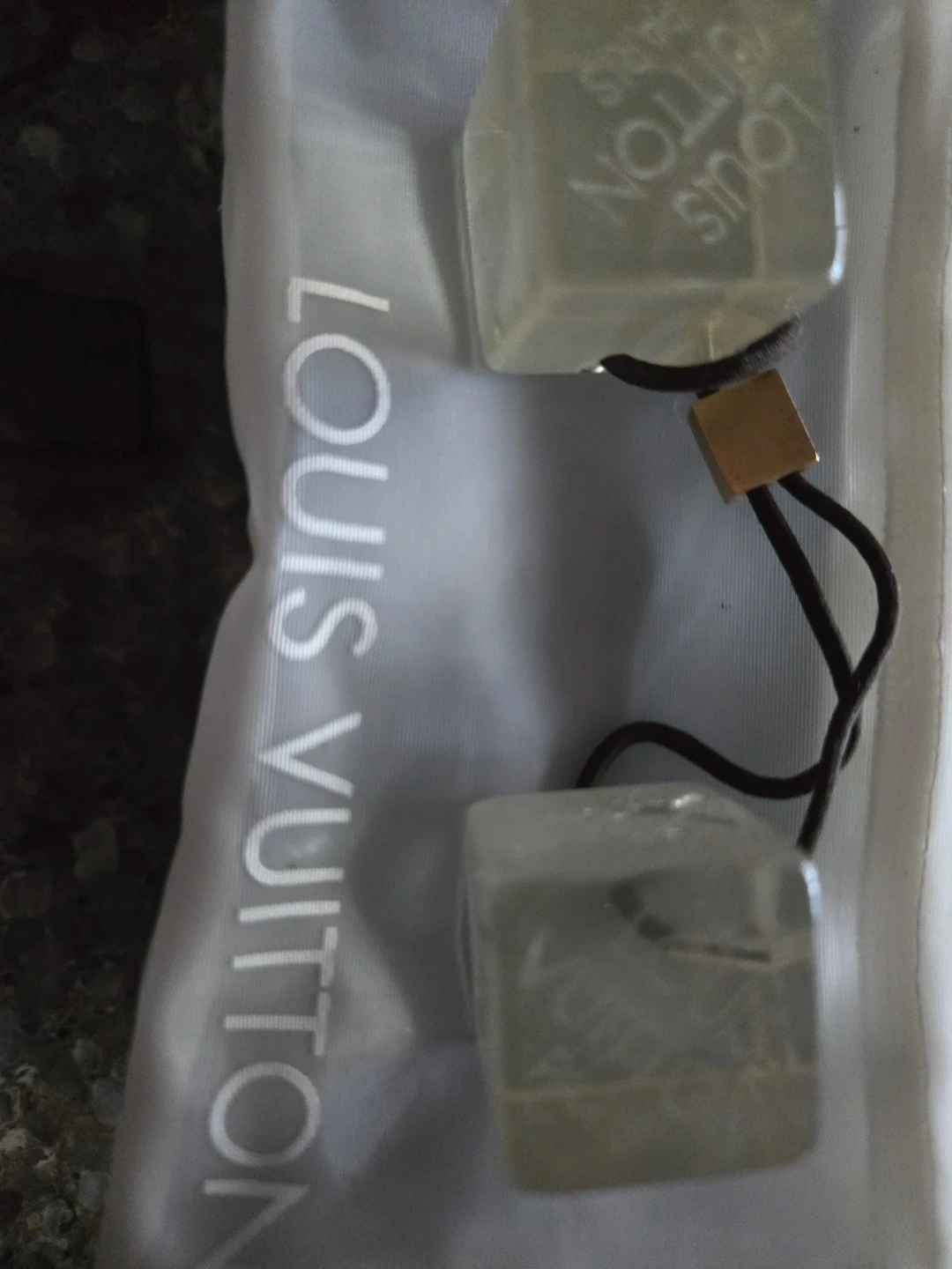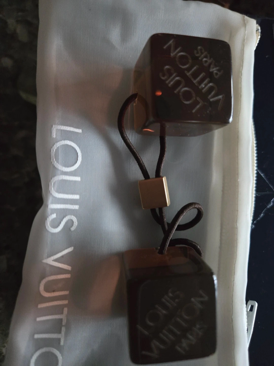 Selling a Louis Vuitton cube hair tie set. The set includes two cube hair ties with the iconic Louis Vuitton logo on each cube. Comes with the original pouch! Brown and clear lucite cubes.