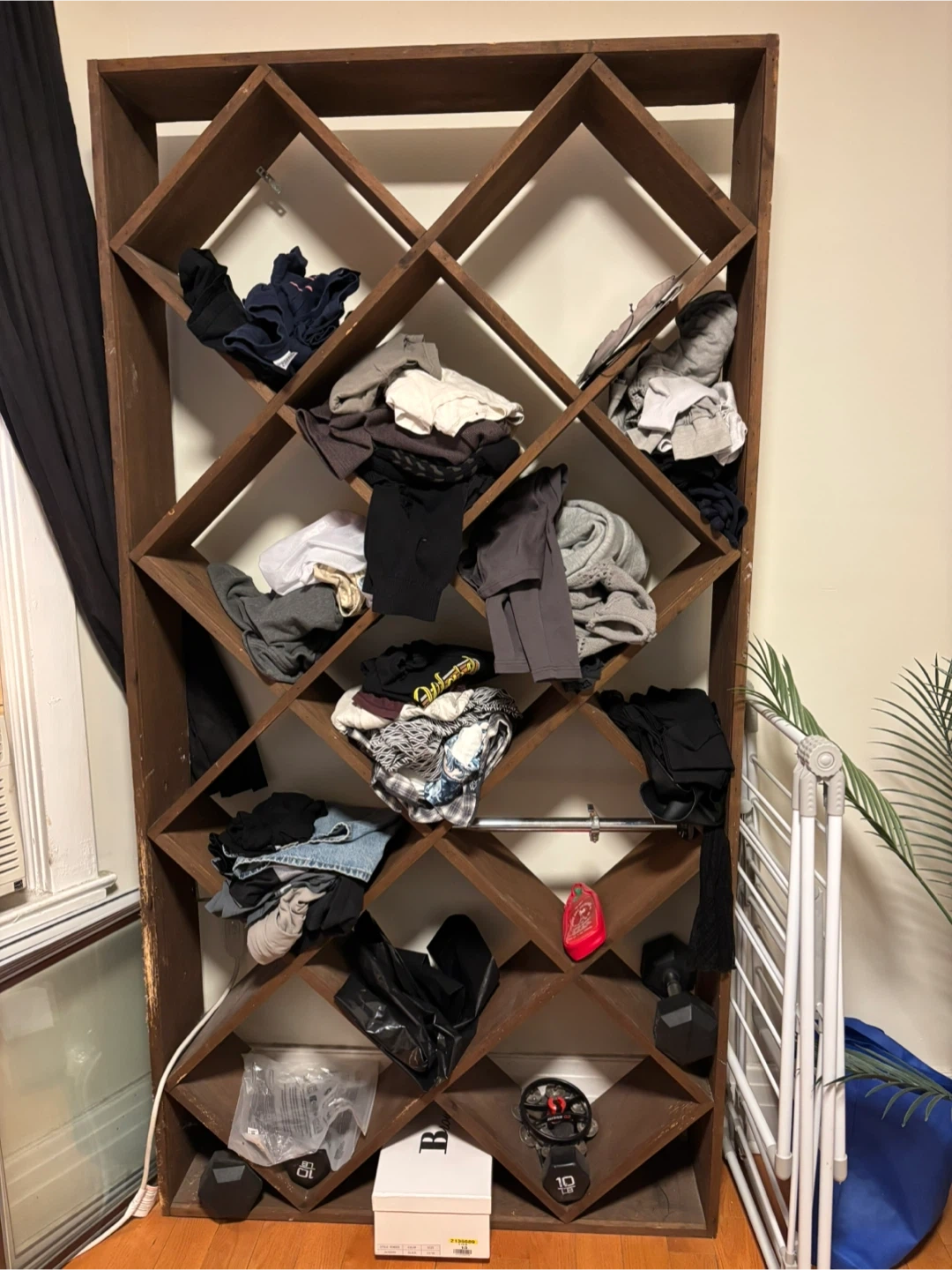 Selling a unique wooden shelf unit with a diamond-shaped design. It's perfect for adding a touch of style to any room. Please note that this is just the shelf unit; other items in the photo are not included