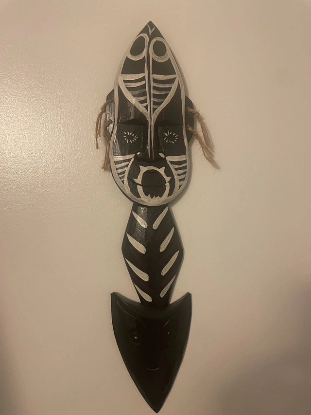 Buy & SellHandcrafted African Tribal Mask – Black & White Wall ArtHandcrafted African Tribal Mask – Black & White Wall Art$40Unique African-style decorative mask. Dark wood with white painted details. Features a carved face and tribal patterns. Includes jute accents.WHERE TO MEETM6jView MapSELLERverifiedTimWest Queen West23513 reviews0 chats·1 favorites·6 viewsSEND CHAT TO SELLERHi Tim! I’m interested in your listing.Hi Tim! I’m interested in your listing.Get the Karrot app to chatSign In to chat