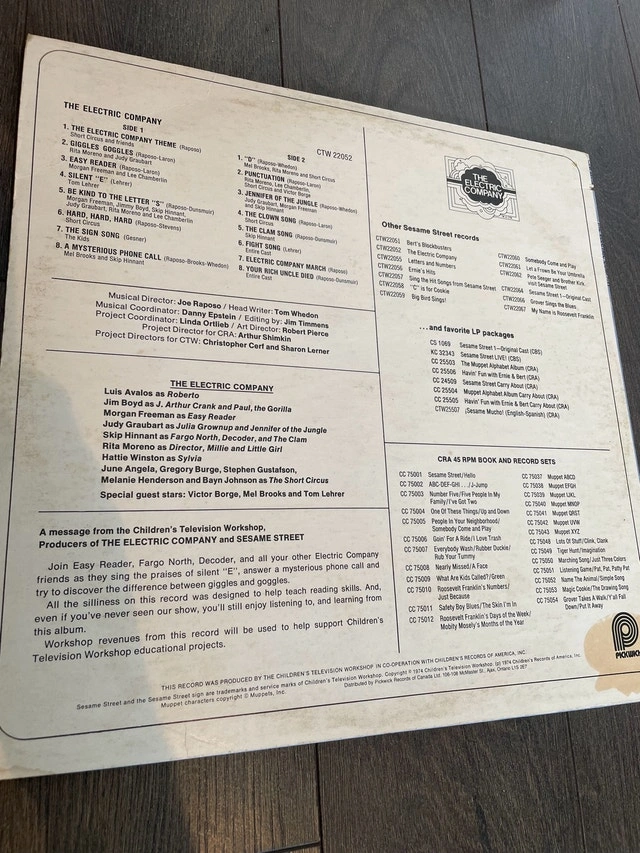 Relive the groovy vibes with this vintage "The Electric Company" record! This CTW 22056 LP features the original cast of the beloved children's show. This record has been enjoyed and shows signs of wear, adding to its retro charm. A nostalgic trip down memory lane for any fan. Side A: * The Electric Company Theme * Singer SIngers * Hey Diddle Diddle Reader * One and One * Silent e * Letter S * Hard, Hard, Hard * Mad Mad * Number Song * Un Telephone Side B: * Fillmore * Function Junction * The Sweet Sweet Swindler * L-y * O-w * The Grocer Green * The Good Things * Seven Little Words * William This record is still available if the ad is up, ready to bring some vintage educational fun to your collection!