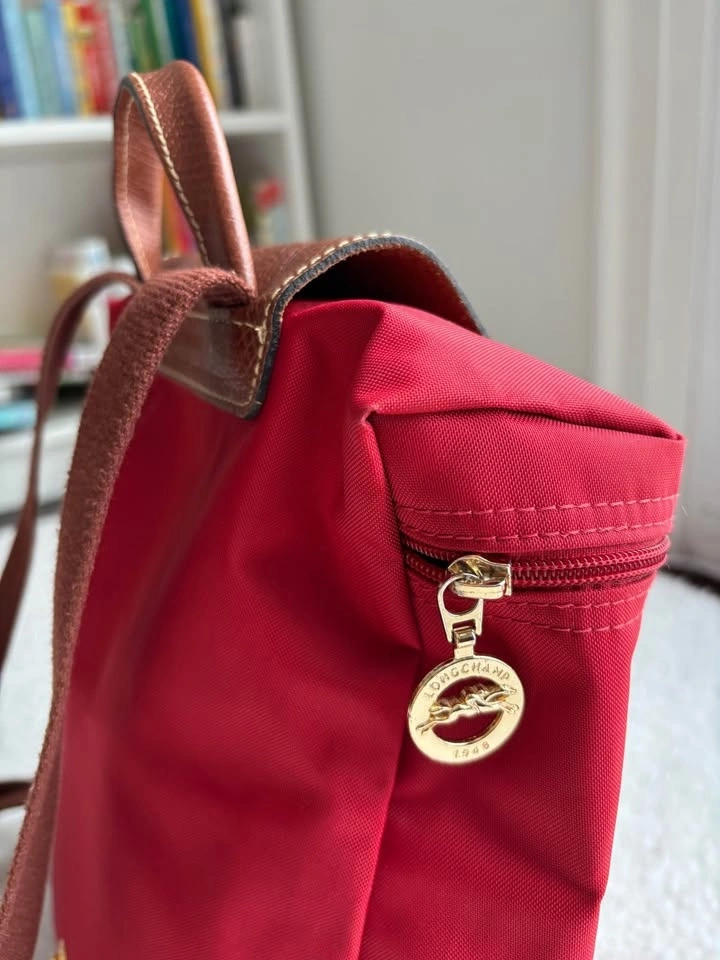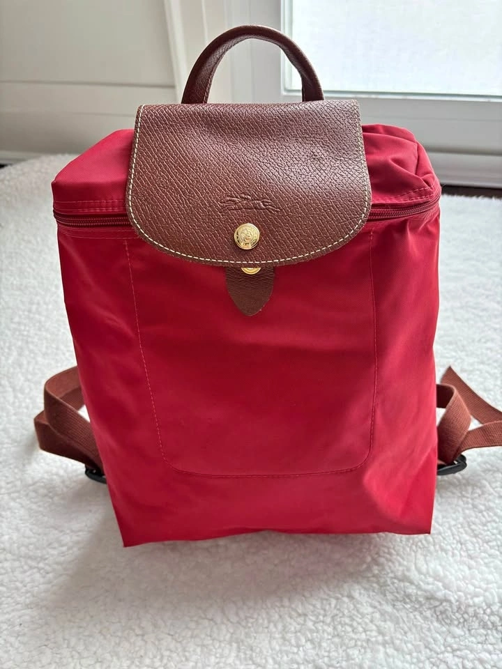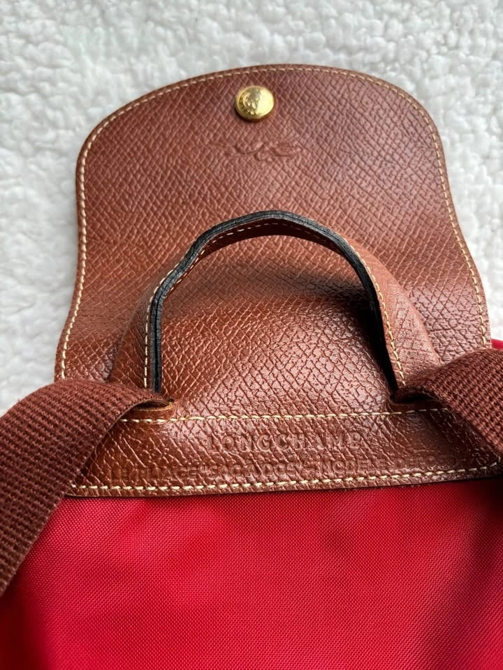 Super cute Longchamp Le Pliage Original backpack in red nylon with brown leather trim in perfect condition (barely used)