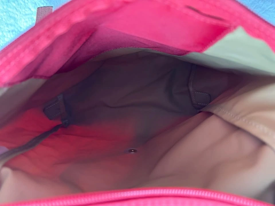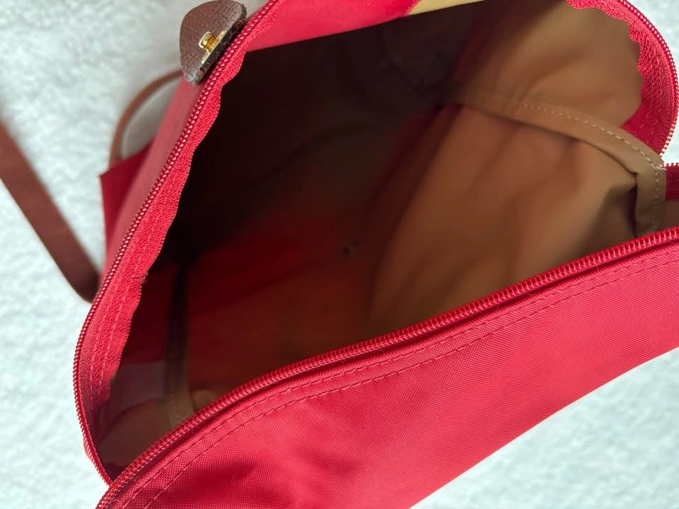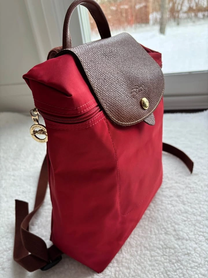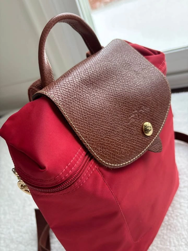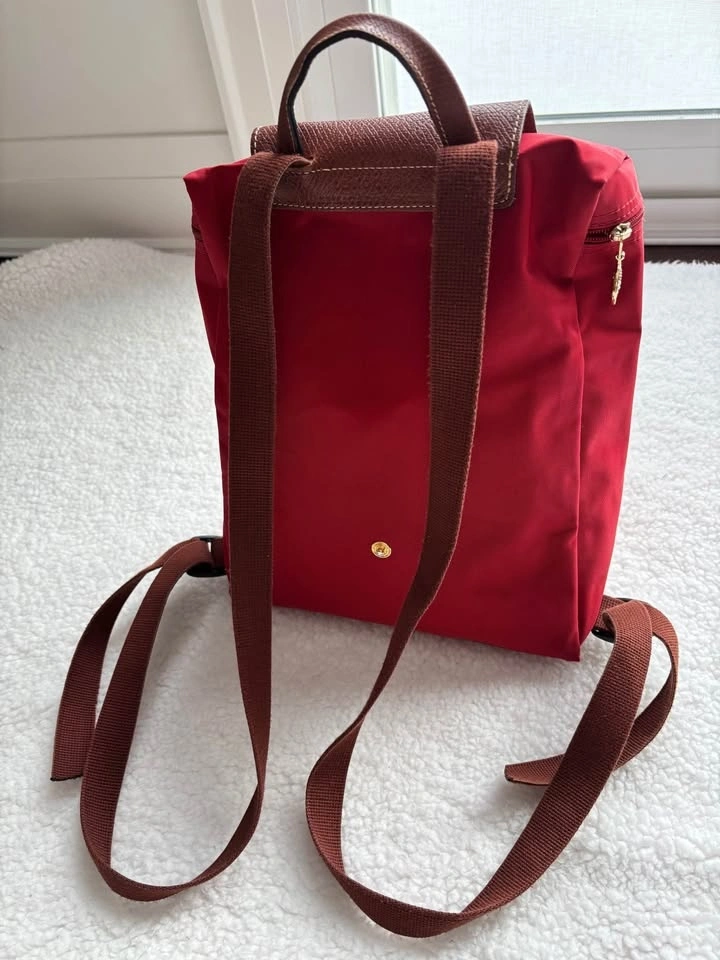 Super cute Longchamp Le Pliage Original backpack in red nylon with brown leather trim in perfect condition (barely used)
