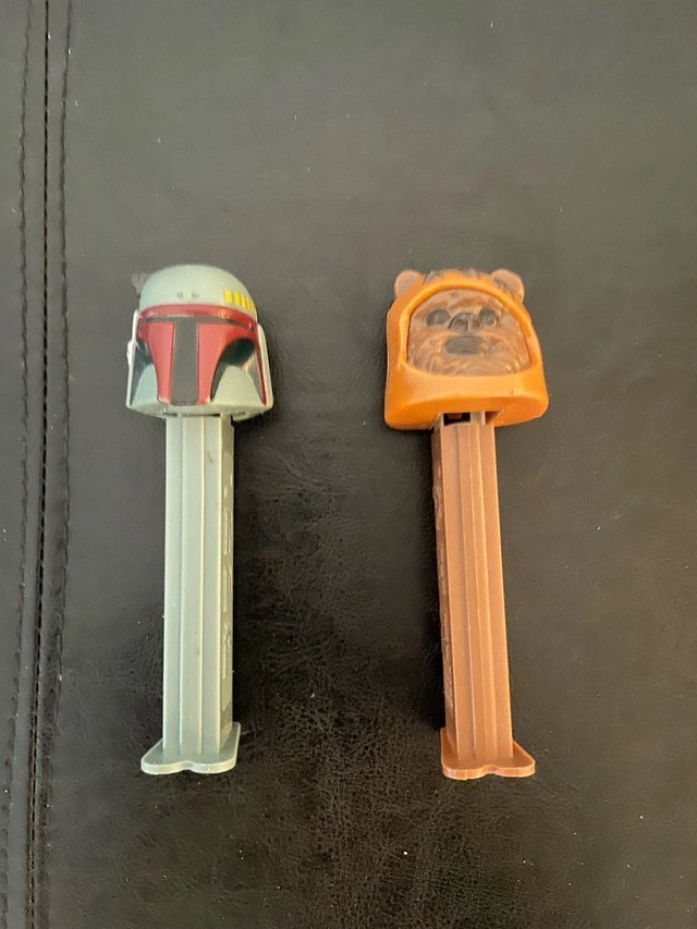 These are two Star Wars Pez dispensers featuring Boba Fett and an Ewok, perfect for collectors or fans! These dispensers are in good condition and ready to dispense some fun. A nostalgic piece for any Star Wars enthusiast. Here are some more details: * Characters: Boba Fett, Ewok * Franchise: Star Wars * Type: Pez dispenser These Pez dispensers are a delightful blast from the past! If the ad is up, they're still available and ready to find a new home. I'm pricing these dispensers at $10 each, based on similar listings on Kijiji.