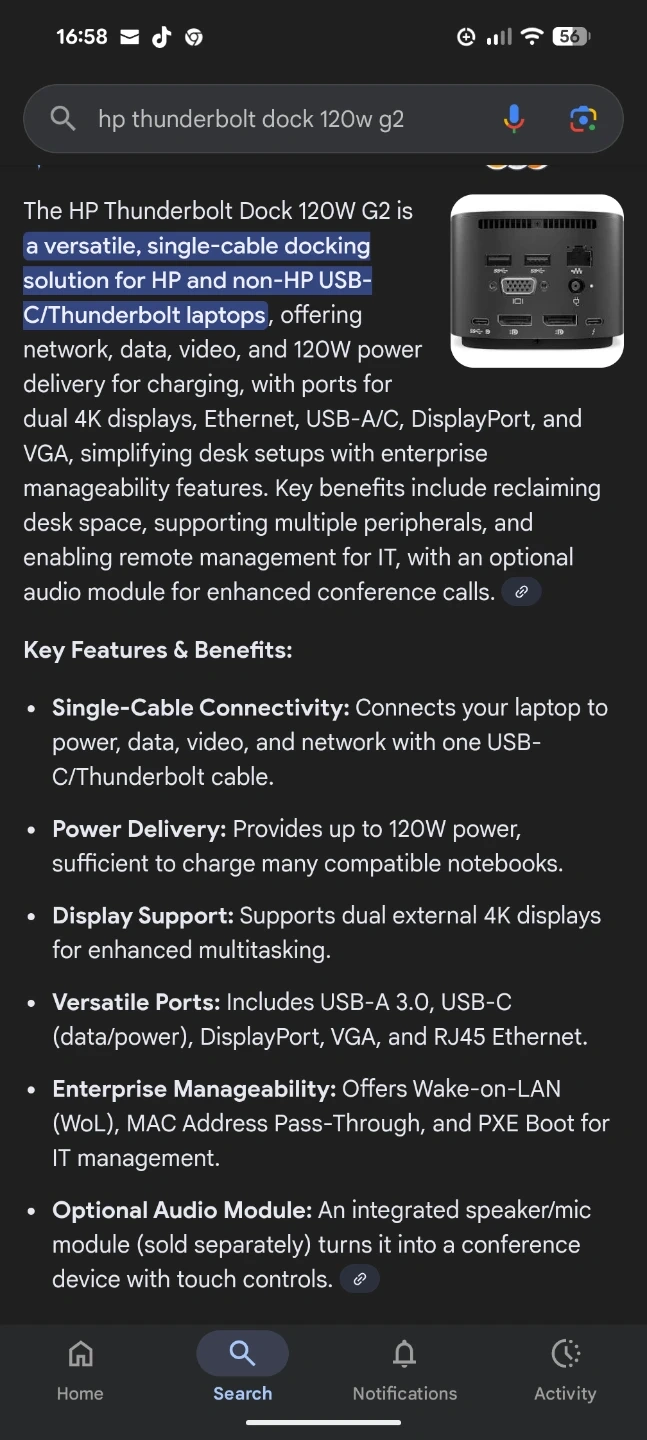 Selling an HP Thunderbolt Dock 120W G2. It's a versatile, single-cable docking solution for HP and non-HP USB-C/Thunderbolt laptops. It offers network, data, video, and 120W power delivery for charging, with ports for dual 4K displays, Ethernet, USB-A/C, DisplayPort, and VGA. It simplifies desktop setups with enterprise manageability features. It connects your laptop to power, data, video, and network with one USB-C/Thunderbolt cable.