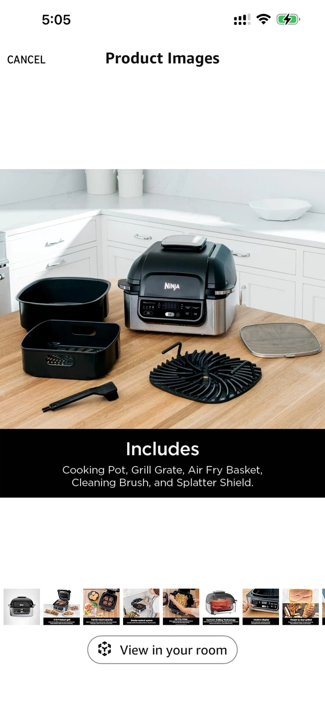 Selling a Ninja Foodi 5-in-1 indoor grill. It includes a cooking pot, grill grate, air fry basket, cleaning brush, and splatter shield. It's perfect for grilling indoors, no matter the weather