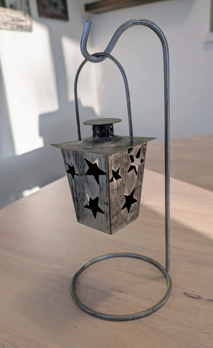 This is a cute star tealight candle lantern on a metal stand. It would be perfect for adding a bit of light to your home or patio.