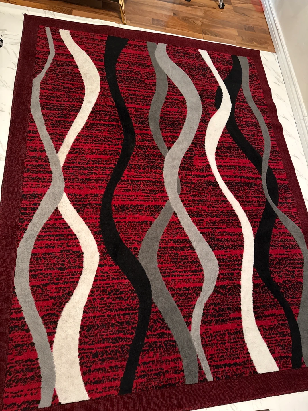 This area rug features a vibrant red background with a wavy pattern in black, grey, and white. It's in great shape and would add a pop of colour to any room!