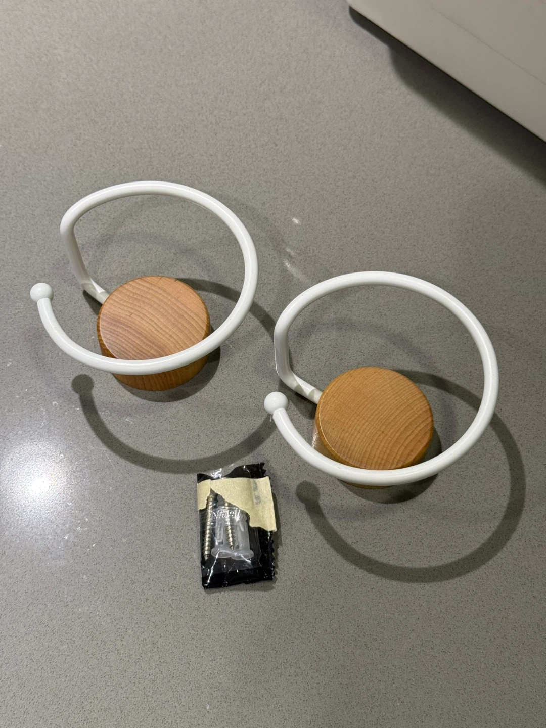 Here's a set of two Umbra Loft wall hooks! They feature a white metal loop and a wooden base. Included are the screws for mounting. These are great for adding a touch of modern style to your entryway or closet