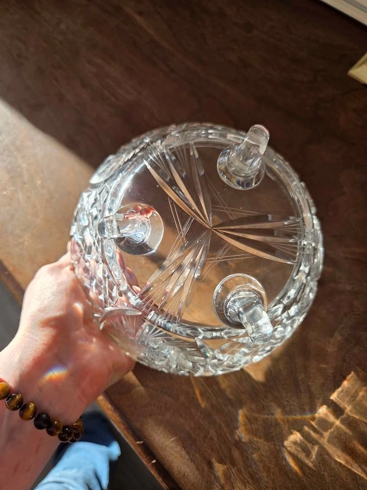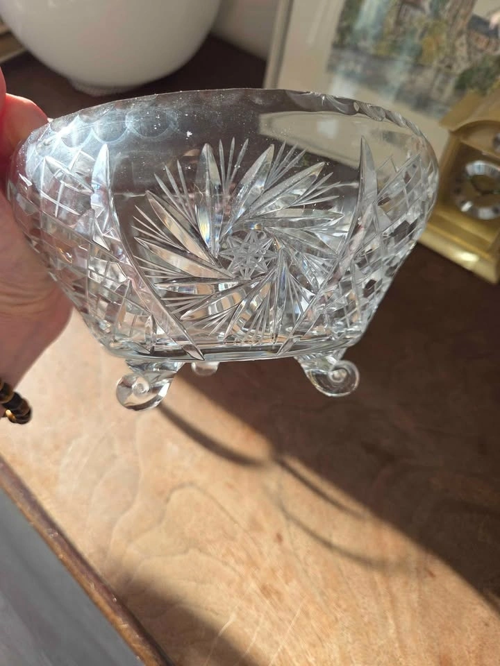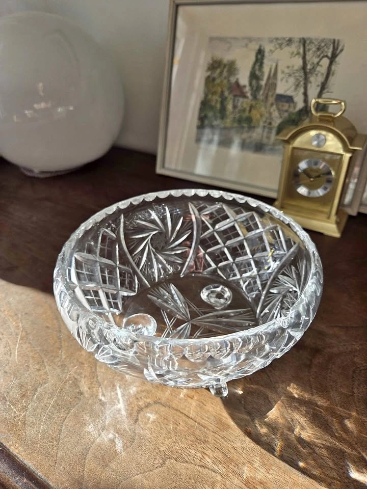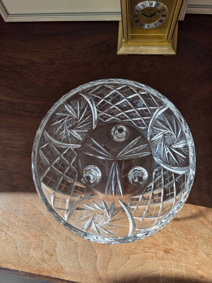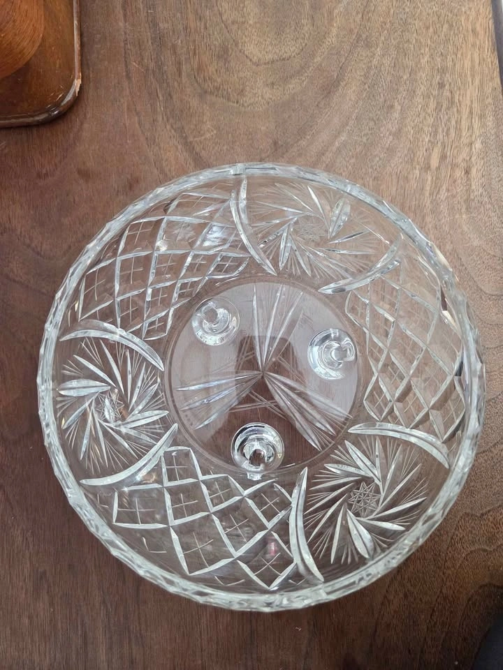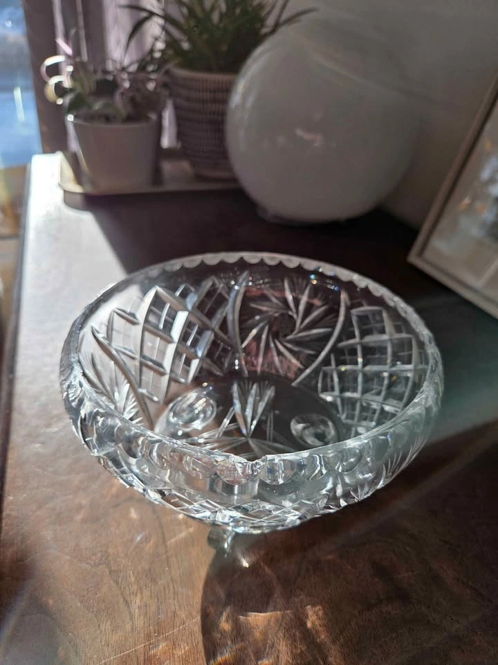 This is a gorgeous, vintage cut glass bowl that I inherited. It is a perfect size for a fruit bowl or any kind of dish you want to entertain with. It is very heavy and sturdy. This dish will make any area in your house look classy and elegant.